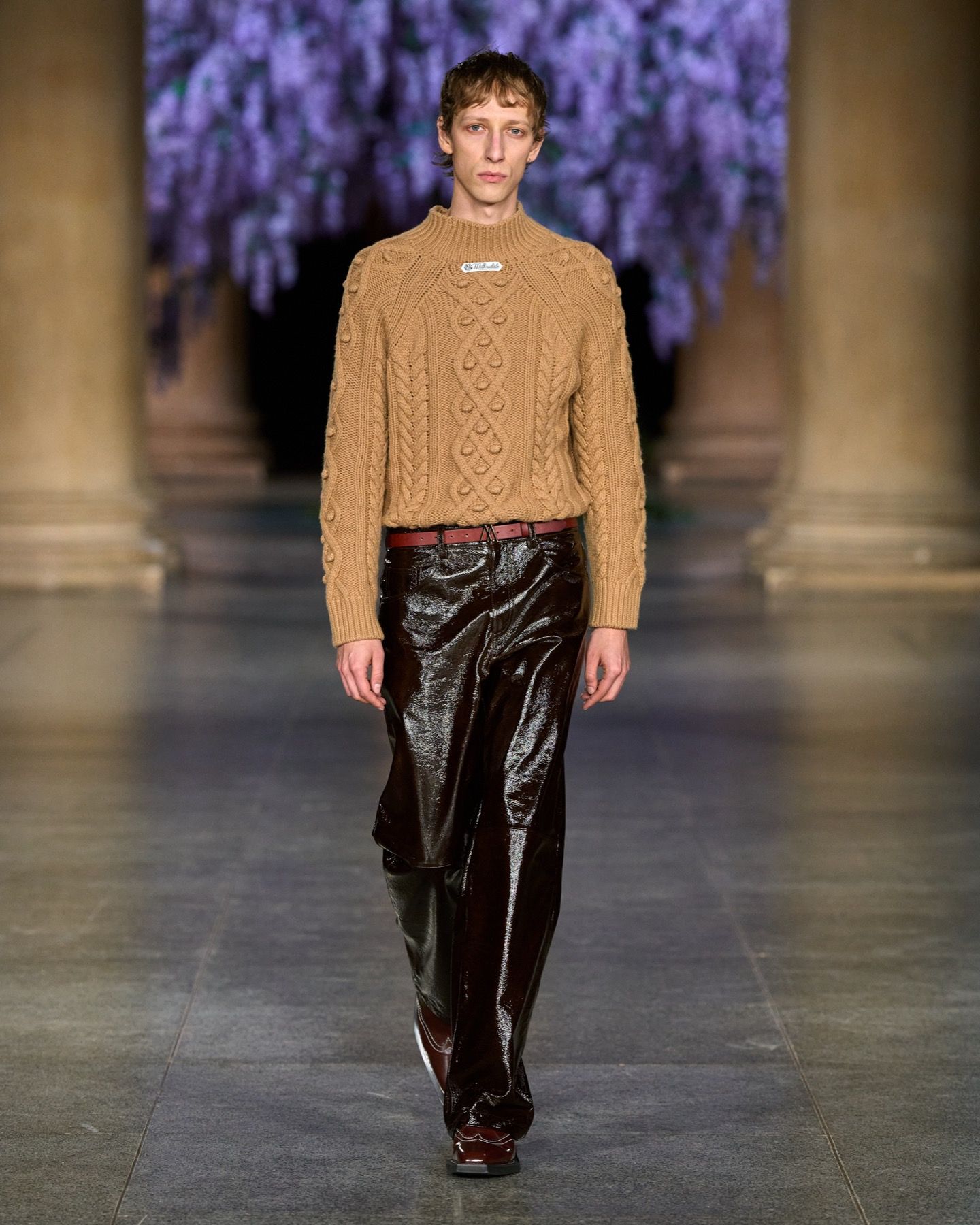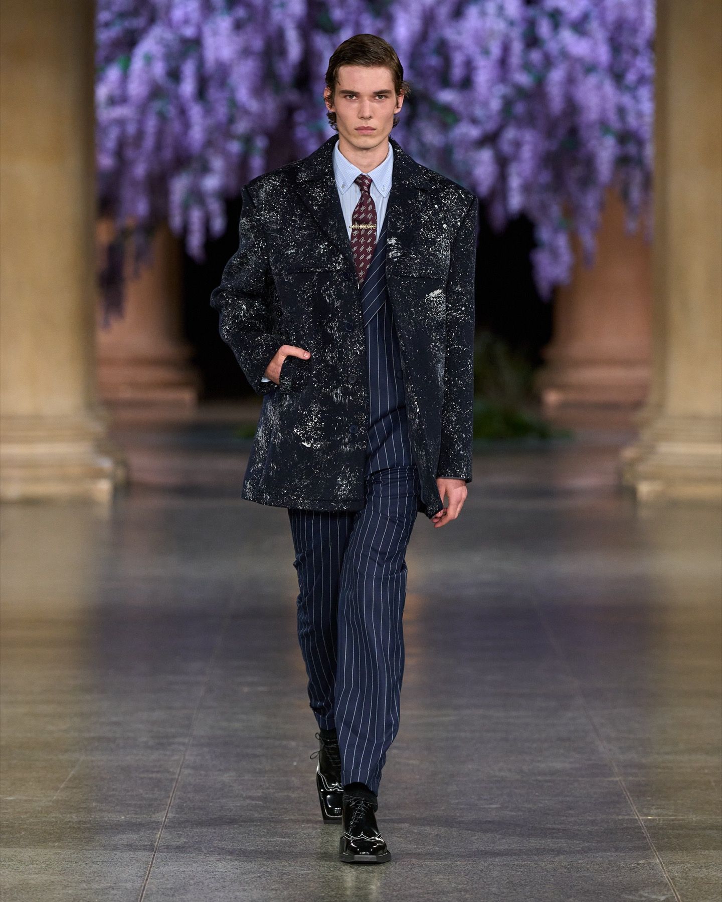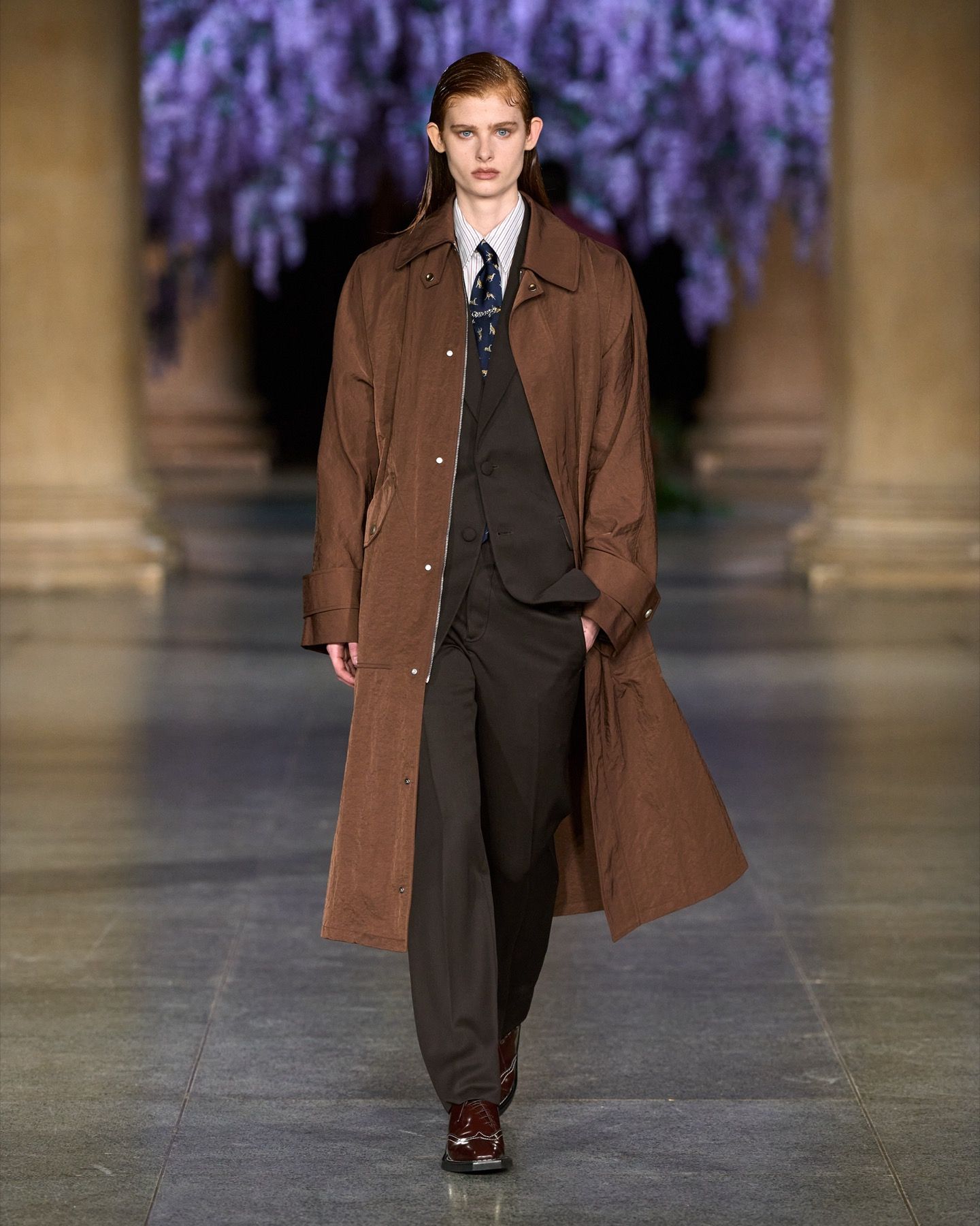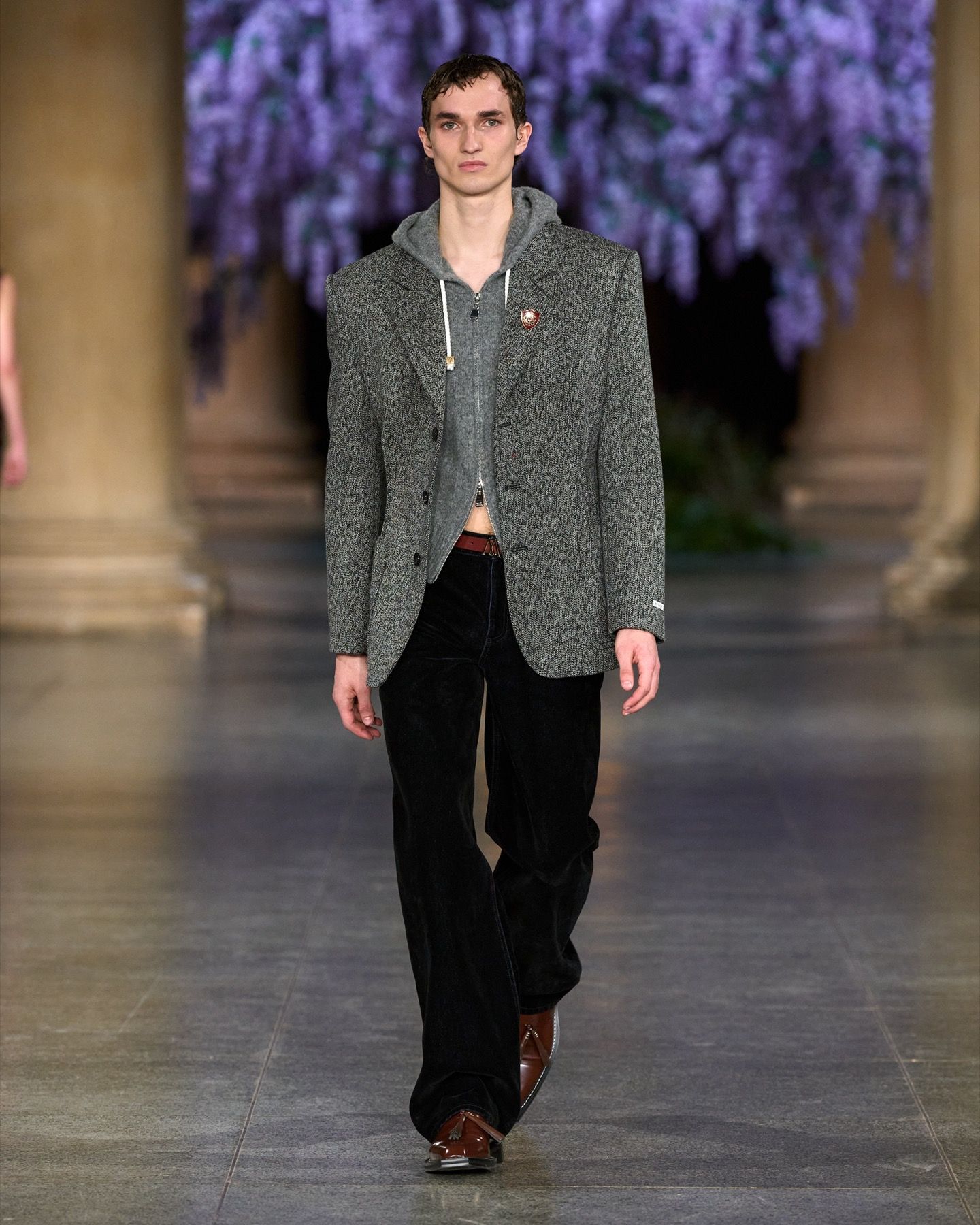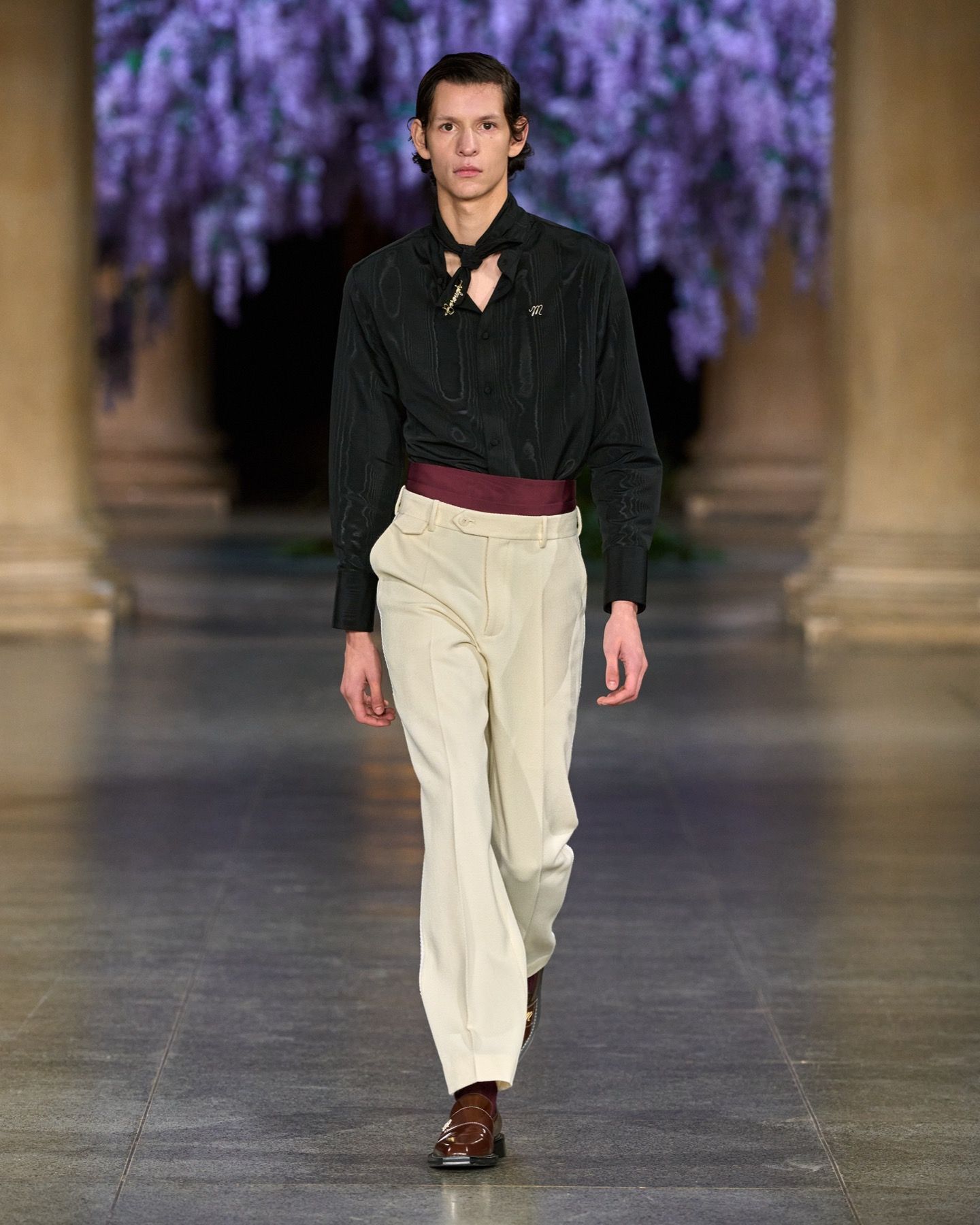 «Being in London for Fashion Week feels like a continuation of a journey», Fletcher explains. The city’s individuality and experimental spirit allow him to explore the language of Mithridate in a confident way, proving how heritage and contemporary influences can coexist as the brand settles into Borough. For Fletcher, the venue carried emotional weight. «Showing at Tate Britain felt like the right place to mark this chapter». Its quiet grandeur mirrored the story he wanted to tell. At the centre of the show space stood a wisteria installation, echoing motifs throughout the collection. «The wisteria symbolised roots taking hold» he says, framing the collection as a metaphor for establishment and growth.