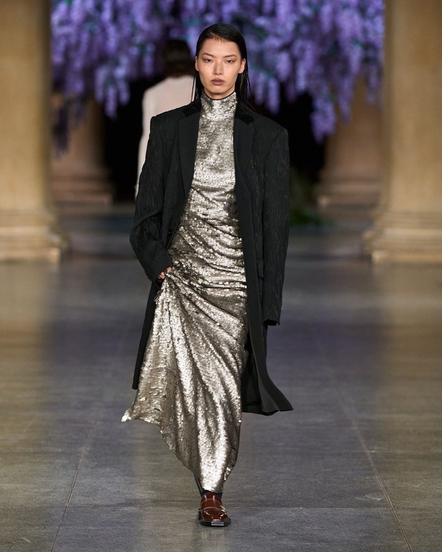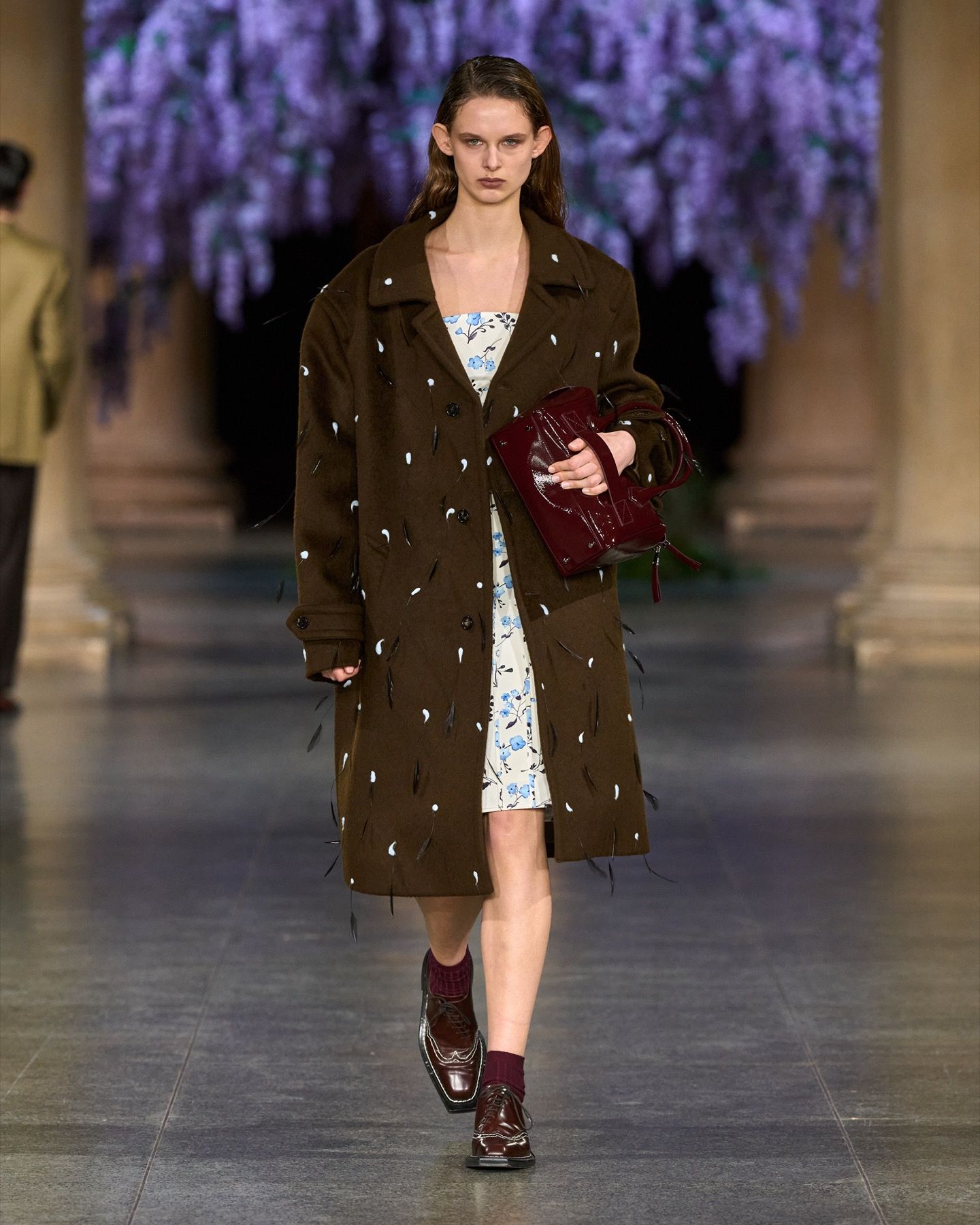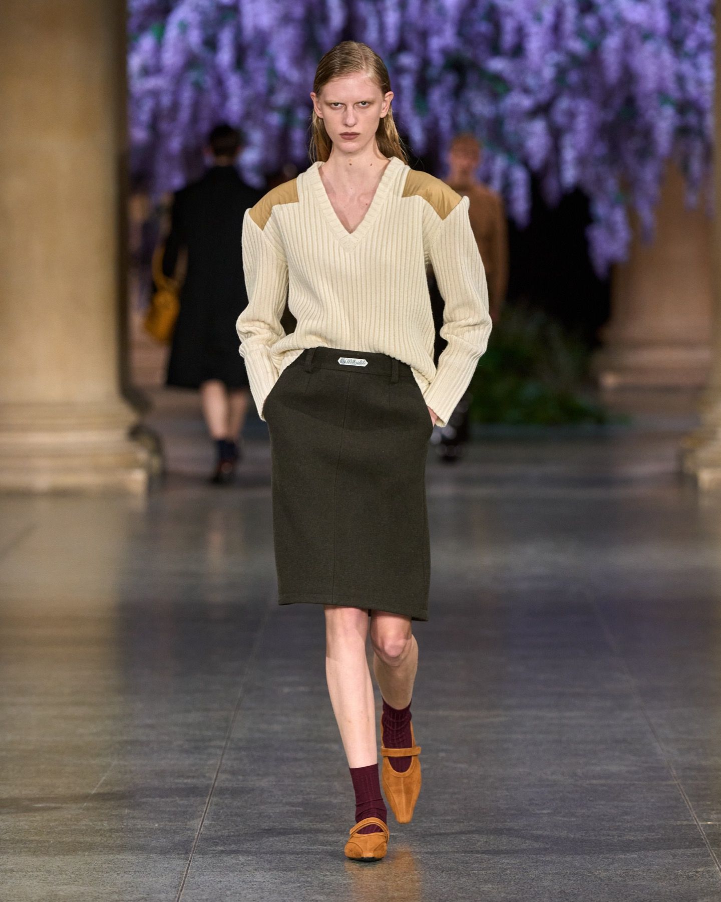 «This collection has been about growth and laying the foundations for something special at Mithridate». Inspired by the Thames, the local markets and the rhythms of Borough, Fletcher revisits house codes through the lens of Savile Row, but in a relaxed, undone way. British tailoring meets layered knitwear, broad shouldered tweed coats sit over sharp suiting, and eveningwear is deconstructed into mini two piece dresses worn under duffle coats. «I wanted to create a balance between structure and ease», Fletcher notes. Knitwear and appliqué add texture, hand beading introduces movement, and the silhouettes reflect a personal approach that also «resonates with how the industry is embracing individuality and hybrid influences».