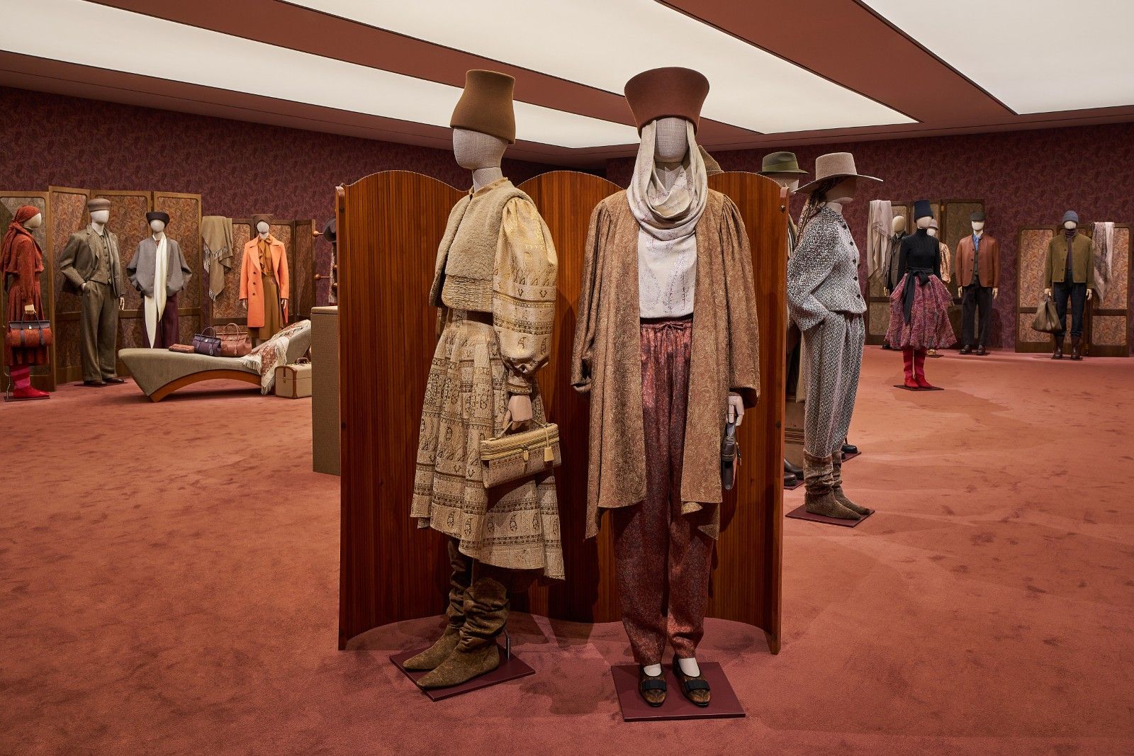 In the central room, the collection was presented through a scenography composed of mannequins flanked by modules covered in Sopravisso wool that highlighted the new bags, while waxed wood cubes arranged along the walls housed the Grande Unita cashmere scarves. The paisley motif, the absolute protagonist, enveloped every environment, from the walls to the nine dividing panels that articulated the spaces.
