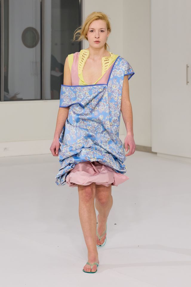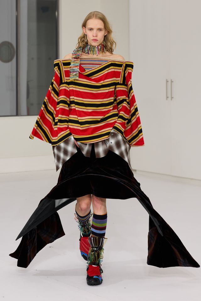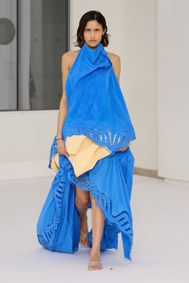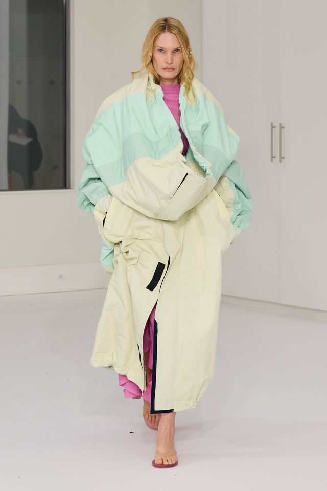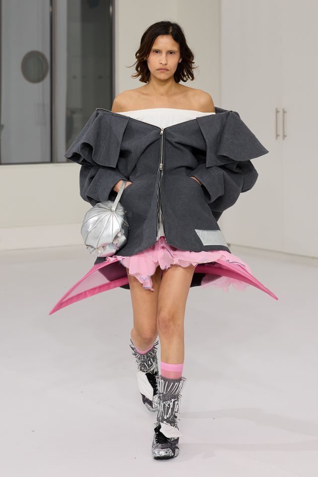 For Paula Lessel, research begins with a simple gesture. “I became obsessed with this process of folding and crumpling pieces of paper,” she explains. From this obsession emerges a method. “The collection is based on a technique that turns something simple, like a rectangle, into something complex.” The starting point is almost childlike; the result is sculptural. Silhouettes appear jagged, caught in a compressed movement. “The collection revolves around the word ‘crush’: it can be something heavy, daunting, but also tender—like having a crush, being in love,” she adds. “I want people to feel this duality.”