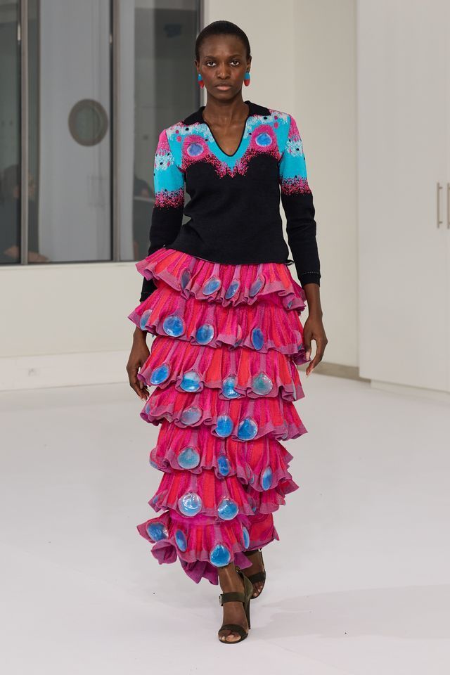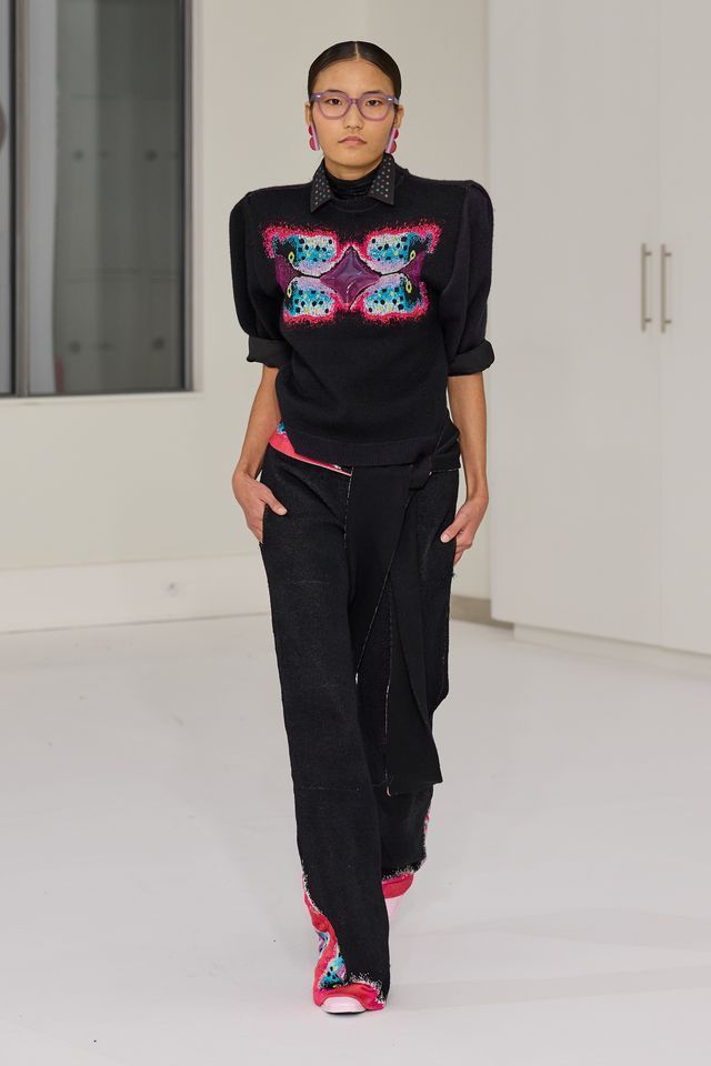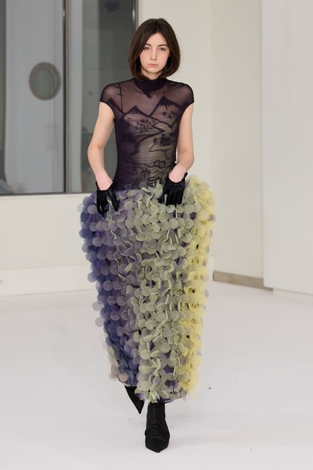 At the other end of the spectrum, Patrick Garvey merges fashion with hard science. His collection, Chromatic Alchemy, embodies this hybrid approach. “I took on the role of a scientist,” he explains. He developed experimental techniques: “I created processes like crystallization to embed embroidery inside knitwear, and methods to encapsulate liquids within knitted structures.” He adds, “My collection is inspired by nature and hybridization.” By integrating chemistry and organic phenomena, he reminds us that fashion doesn’t thrive in isolation. To remain relevant, it must engage with its time, dialogue with other disciplines, and reflect scientific, ecological, and societal questions.