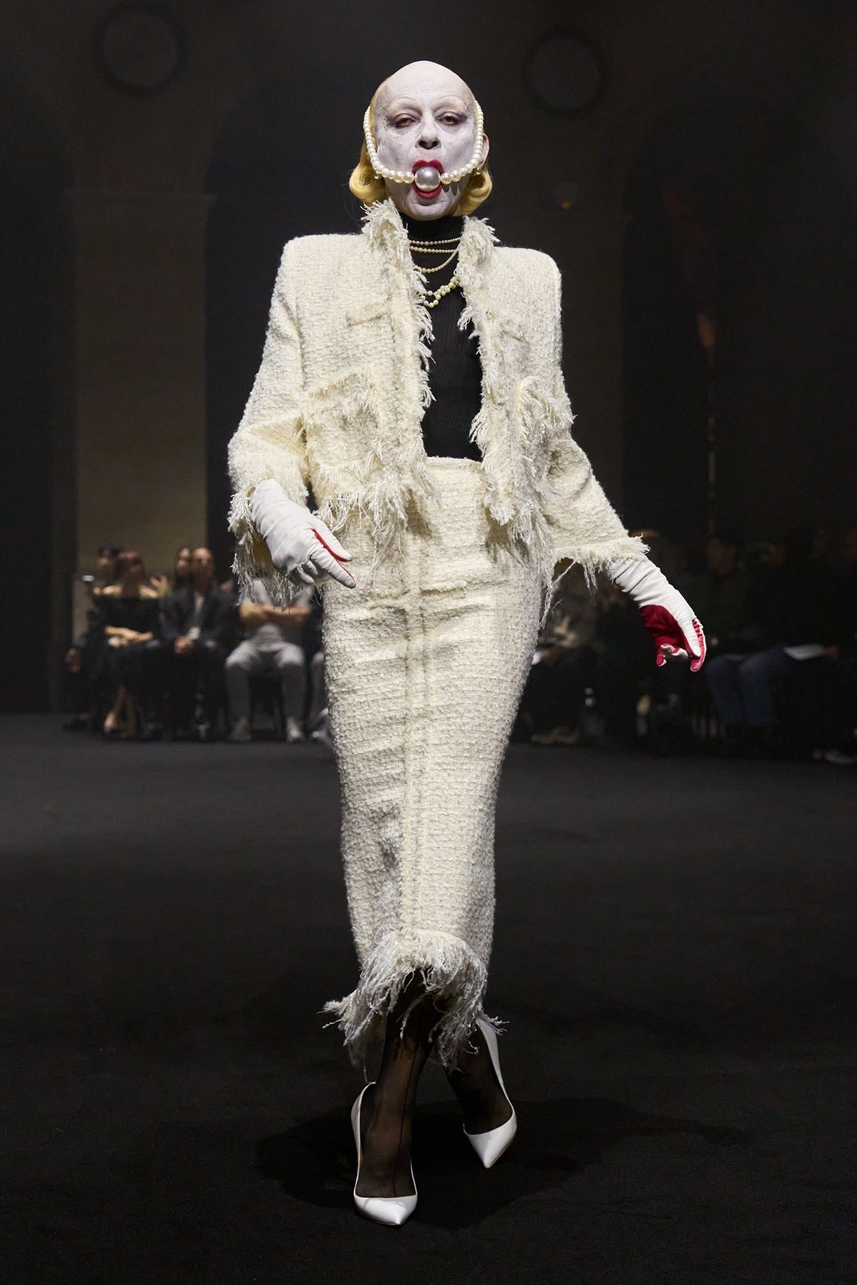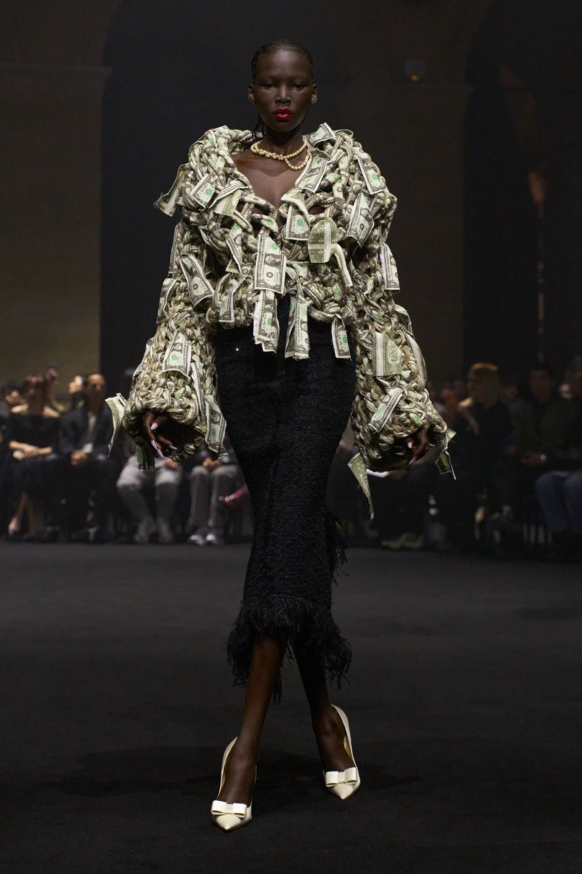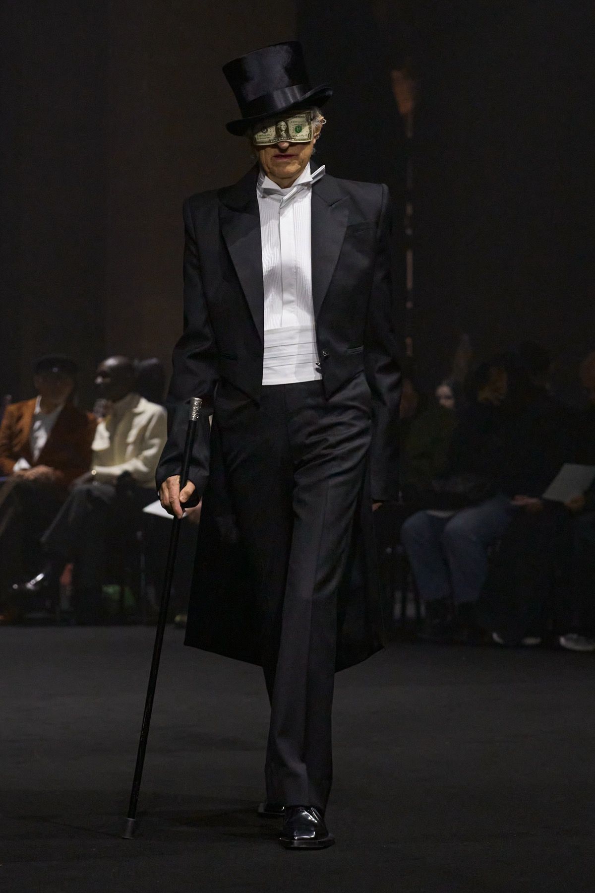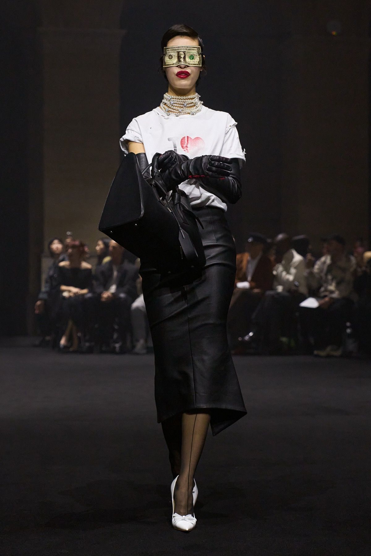 The “Guilt Gloves” are introduced - long white lambskin gloves with red-stained palms that not only perfectly dialogue with the heeled shoes designed with Louboutin, but also reveal the vulnerability and terror that exist at the top. Money, the ultimate symbol of power, materializes in the banknote-shaped masks worn by the models, paired with luxcore daywear looks crafted from fine fabrics such as double-face cashmere used for the coats, déchirer tweed for the suits, and refined Prince of Wales sourced from Manchester.