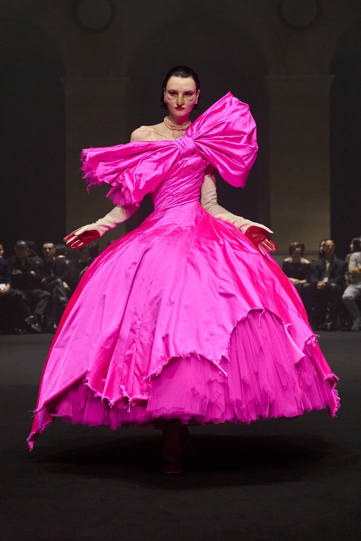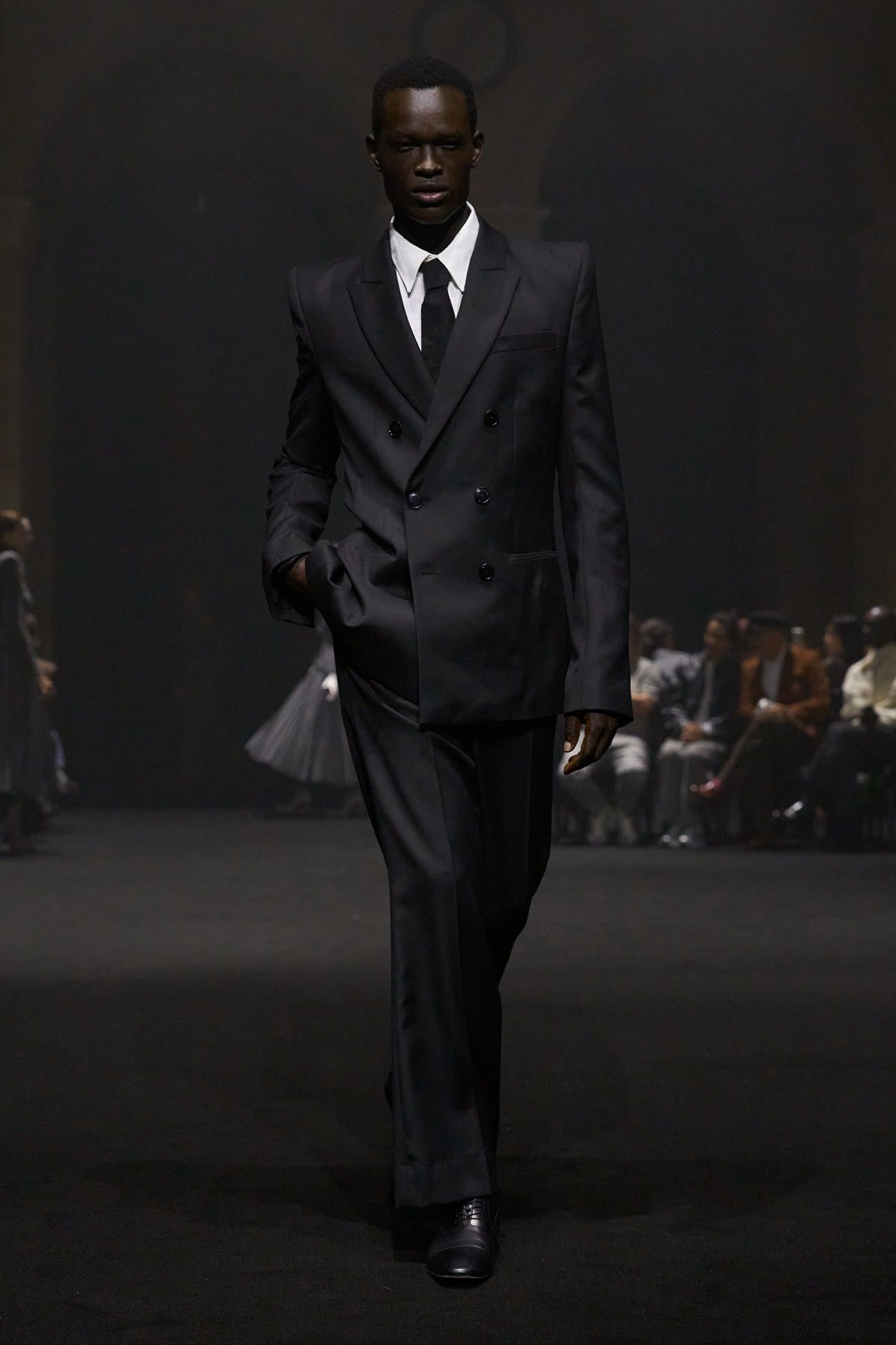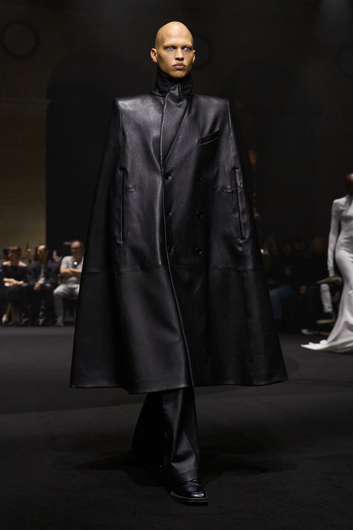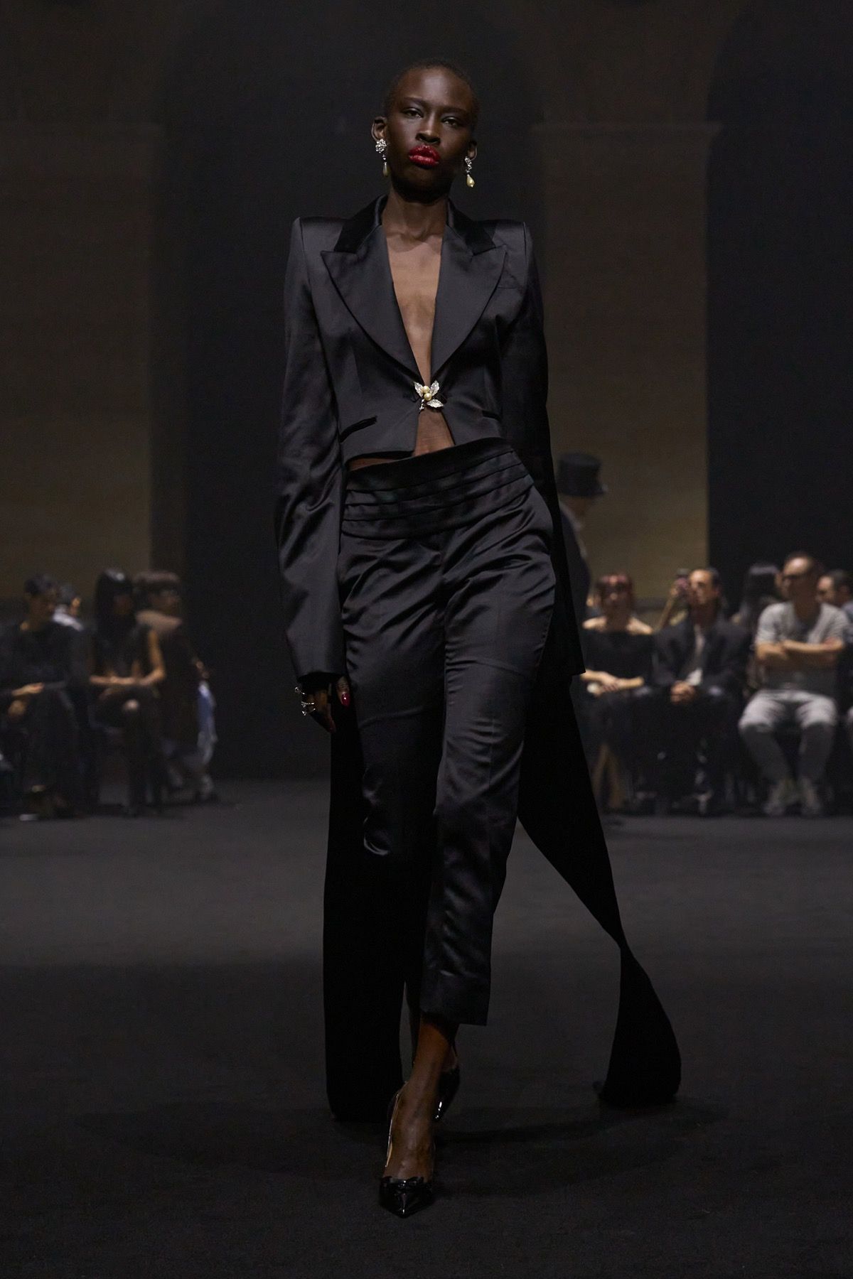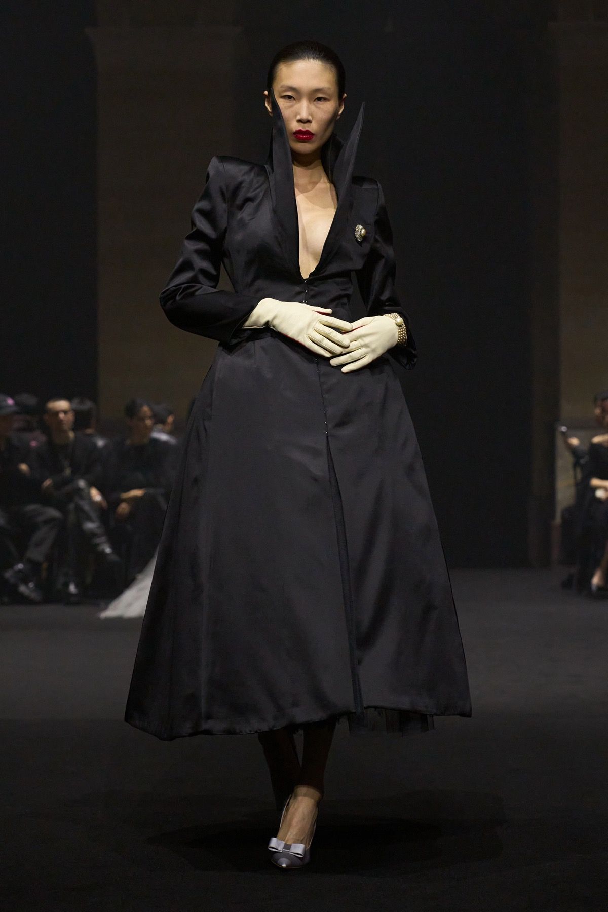 The “Guilt Gloves” are introduced - long white lambskin gloves with red-stained palms that not only perfectly dialogue with the heeled shoes designed with Louboutin, but also reveal the vulnerability and terror that exist at the top. Money, the ultimate symbol of power, materializes in the banknote-shaped masks worn by the models, paired with luxcore daywear looks crafted from fine fabrics such as double-face cashmere used for the coats, déchirer tweed for the suits, and refined Prince of Wales sourced from Manchester.