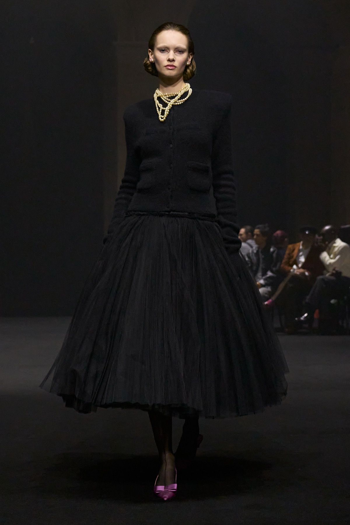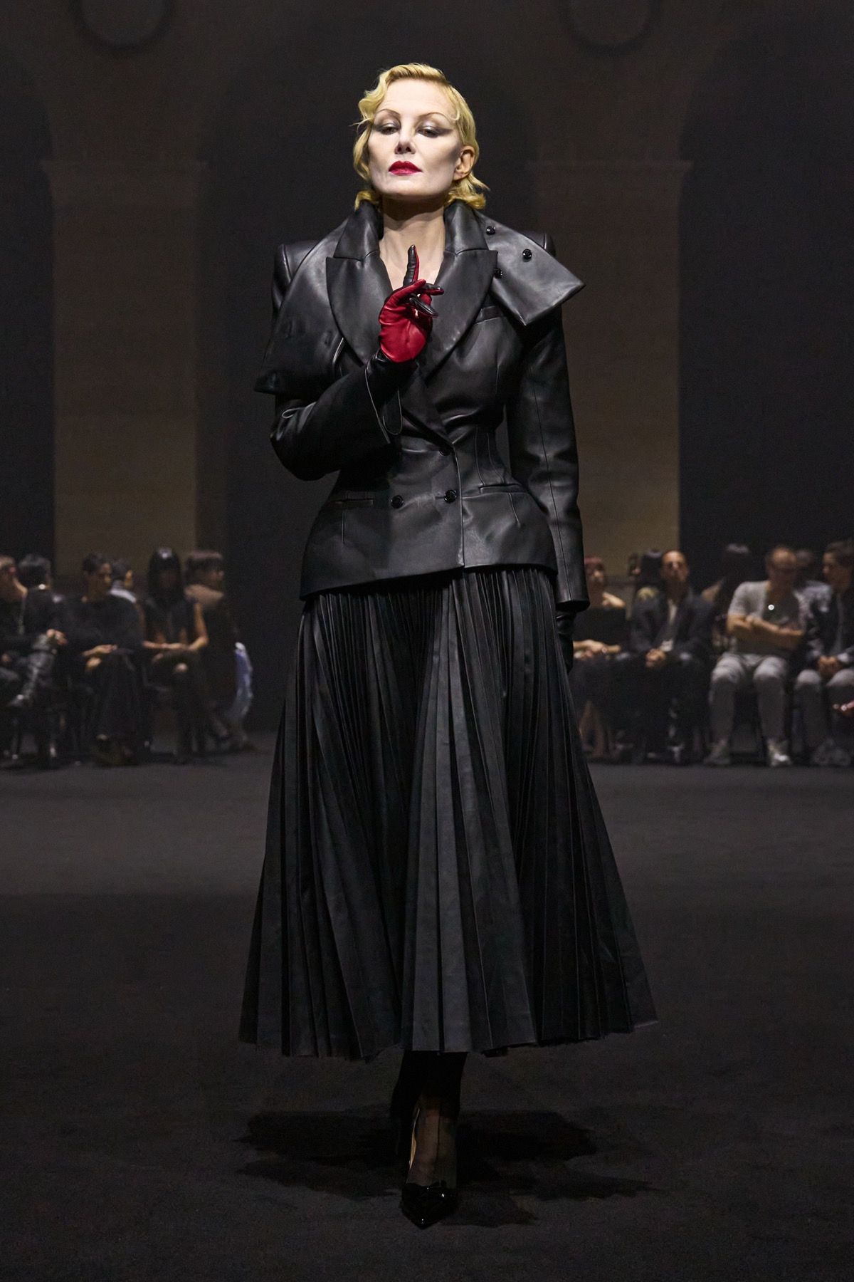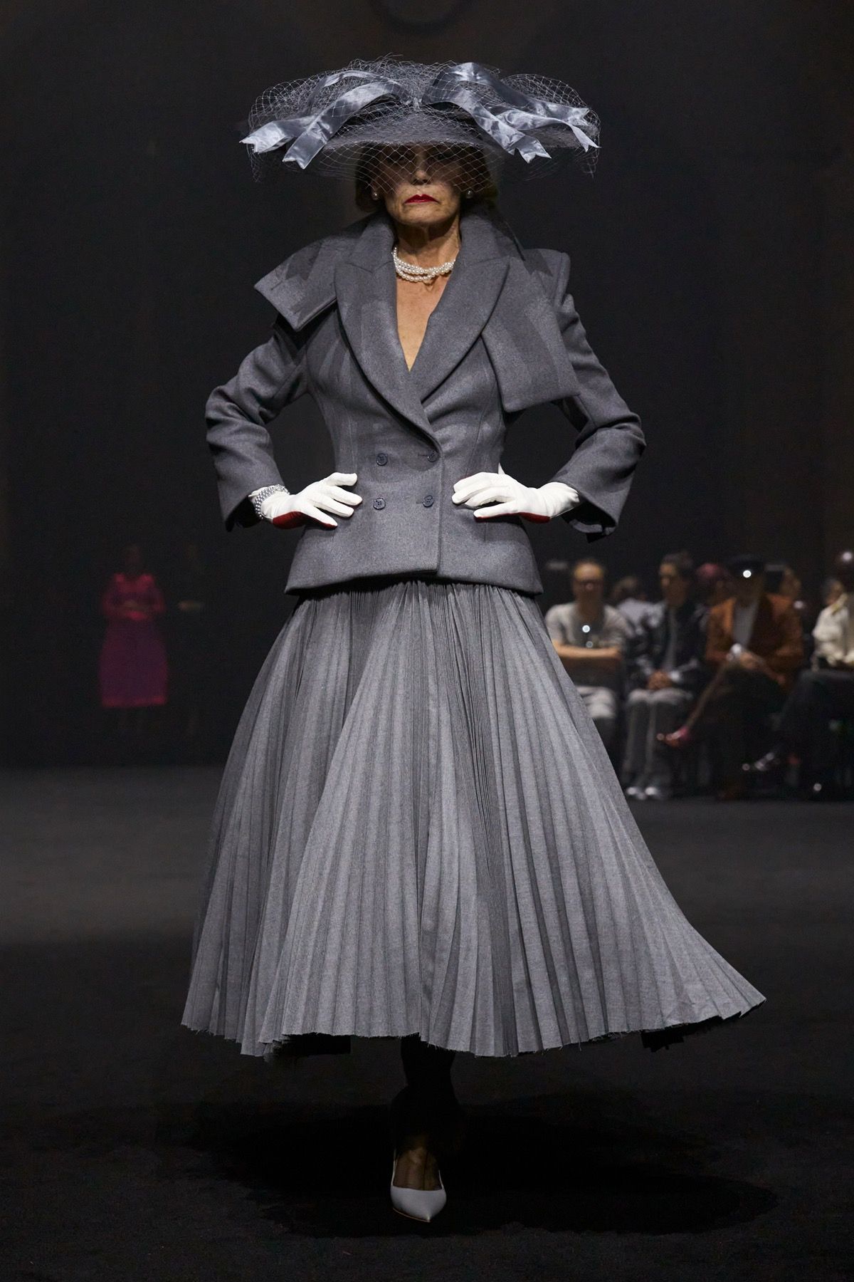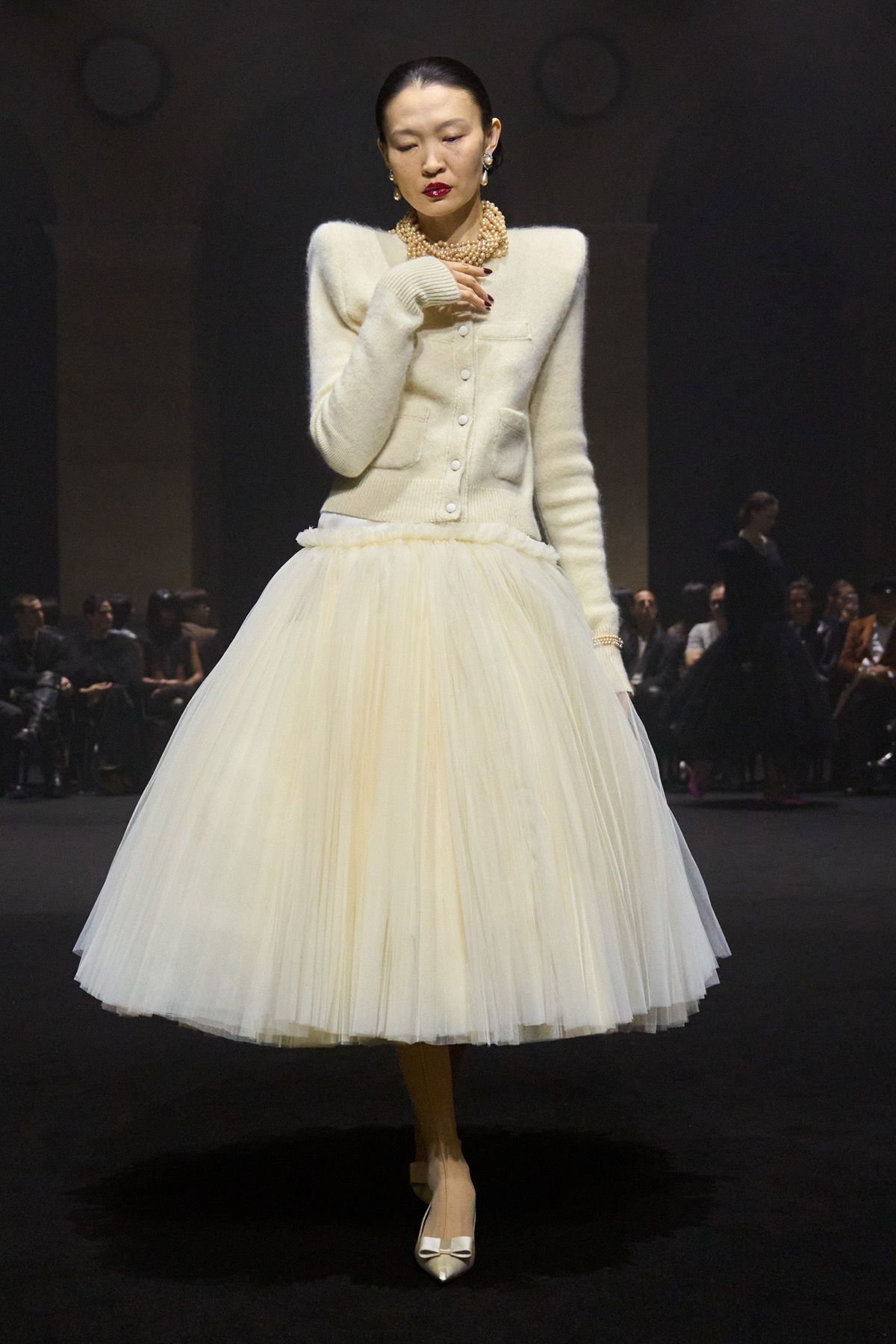 The “Guilt Gloves” are introduced - long white lambskin gloves with red-stained palms that not only perfectly dialogue with the heeled shoes designed with Louboutin, but also reveal the vulnerability and terror that exist at the top. Money, the ultimate symbol of power, materializes in the banknote-shaped masks worn by the models, paired with luxcore daywear looks crafted from fine fabrics such as double-face cashmere used for the coats, déchirer tweed for the suits, and refined Prince of Wales sourced from Manchester.
