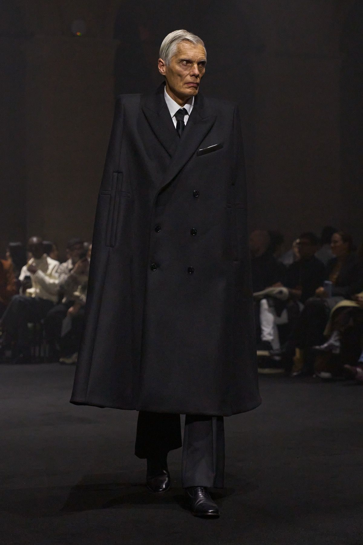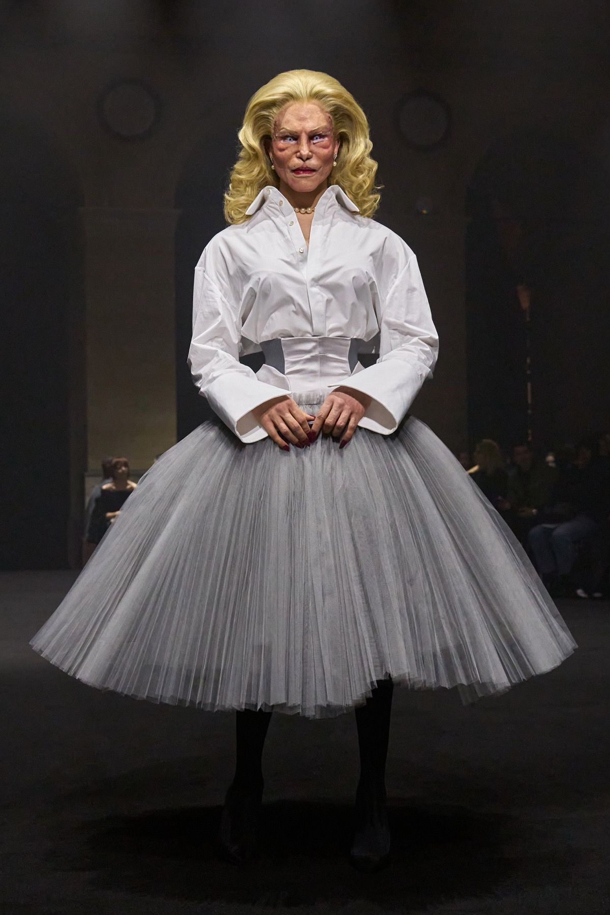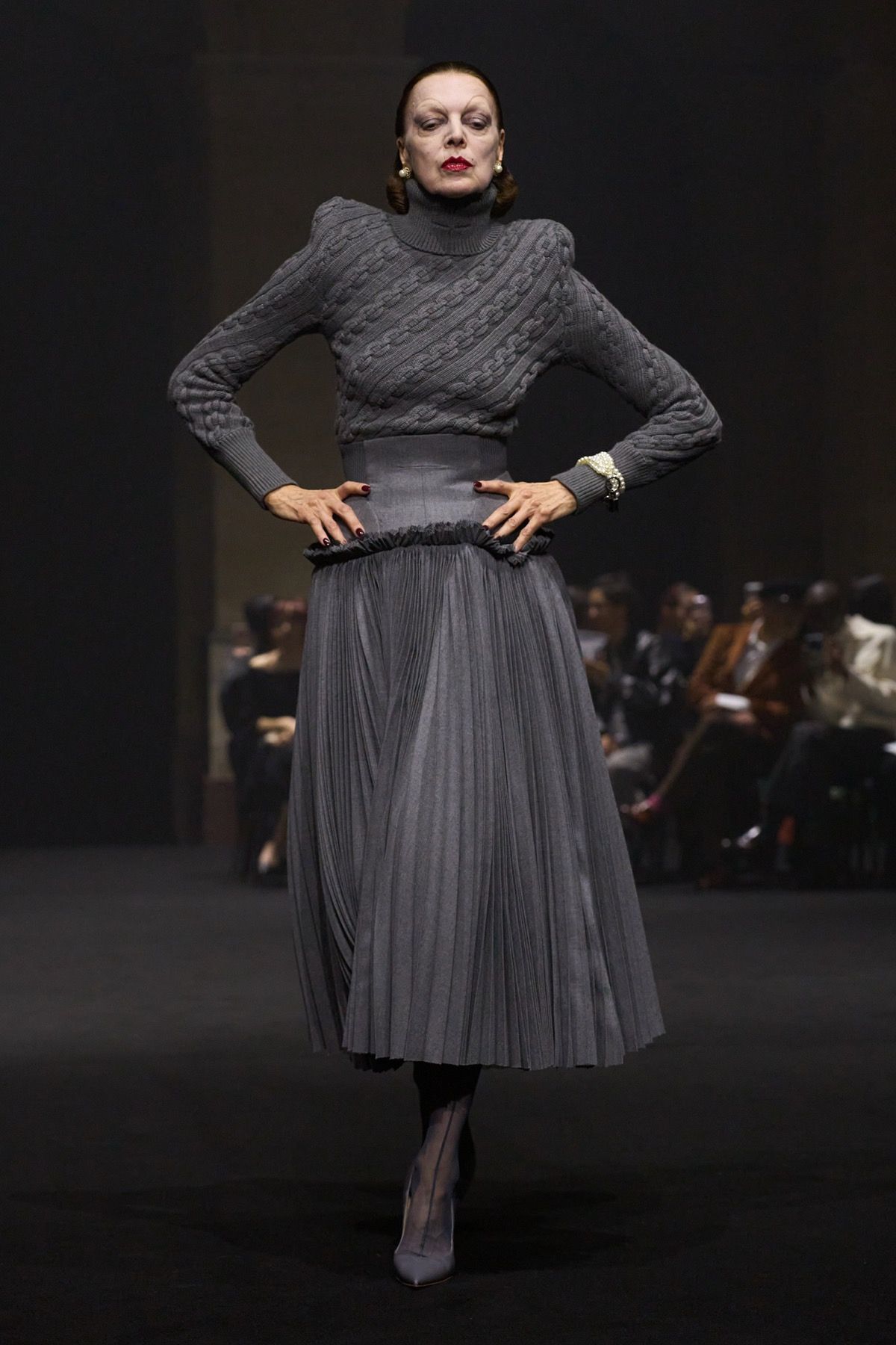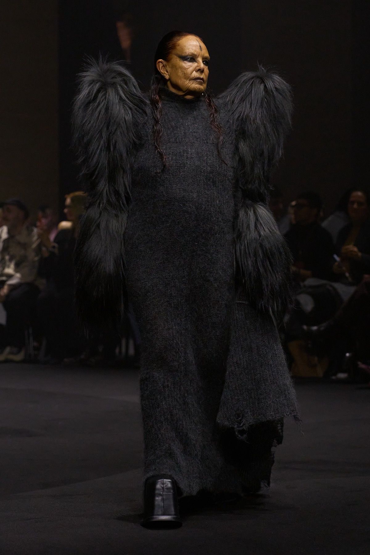 The creative duo ventures into this territory of privilege through figures such as Bryan Johnson, who does not use such tools to improve his outer shell out of vanity, but is obsessed with his inner imperfections and the extension of human life. At the opposite extreme stands Michèle Lamy, friend and Parisian mother of the brand: rebellious, she transcends time and embraces the natural beauty of aging in the most glamorous way possible, wearing ash-gray goat fur sleeves and a distorted wool knit dress.