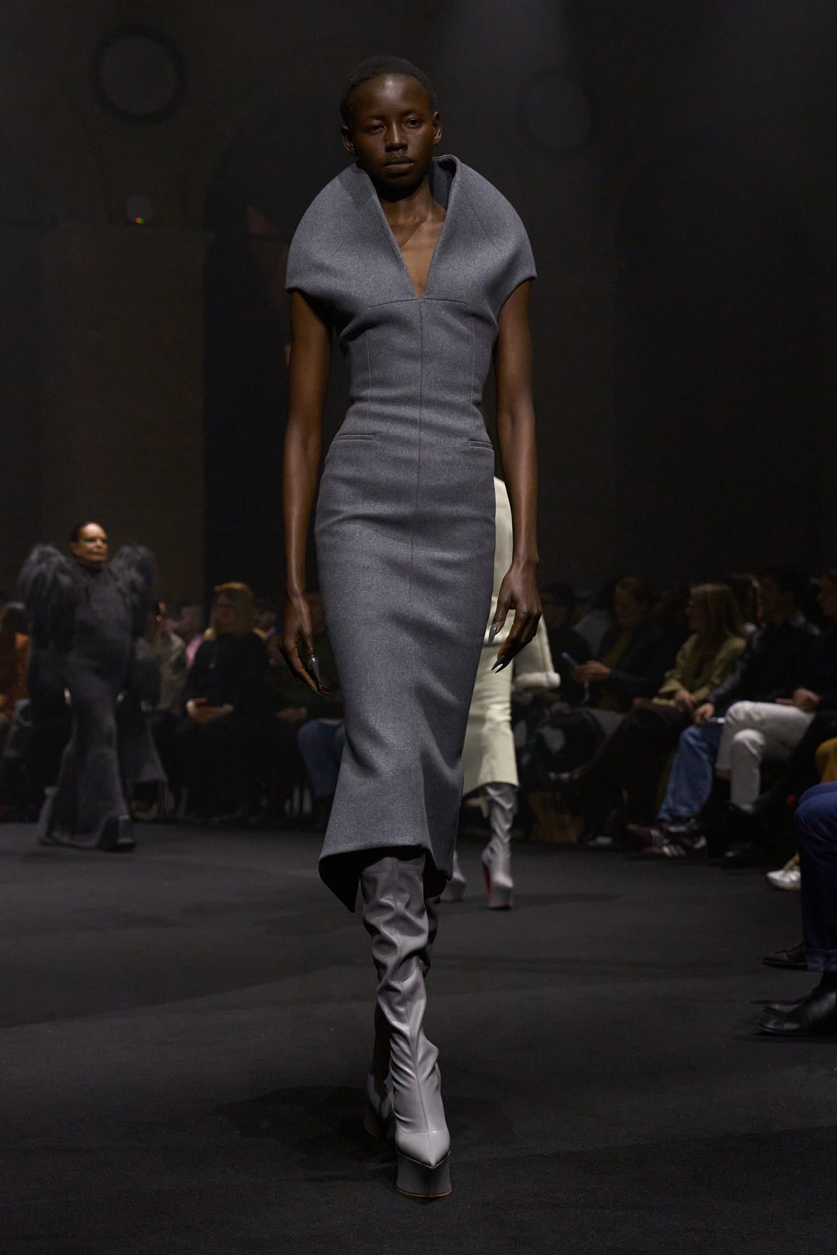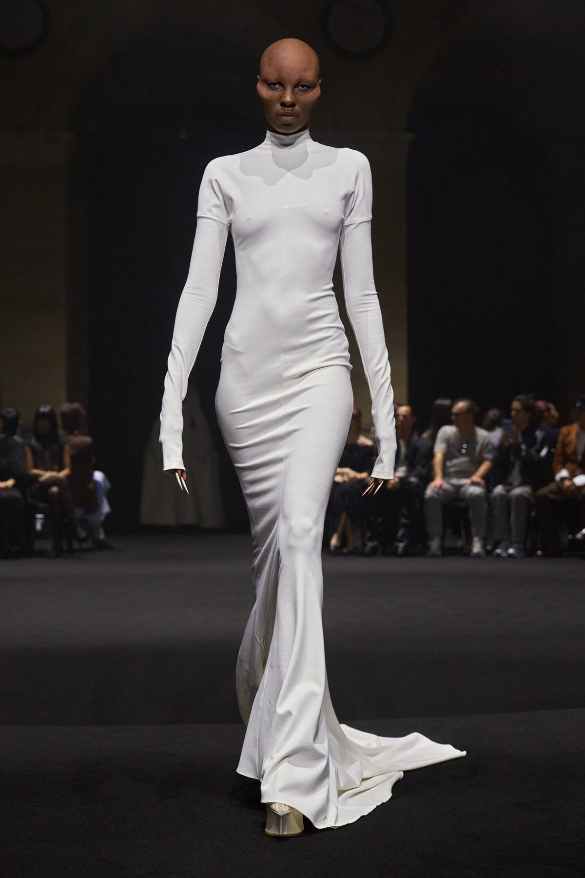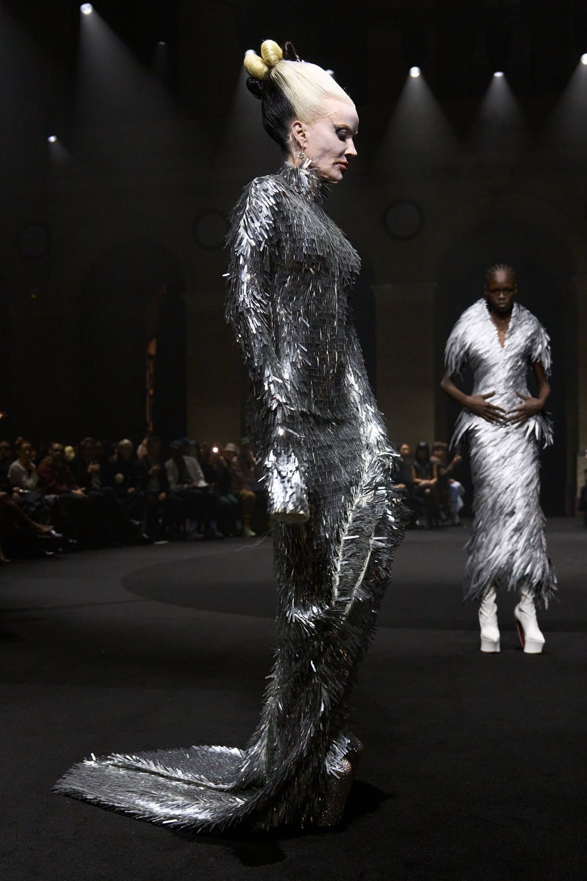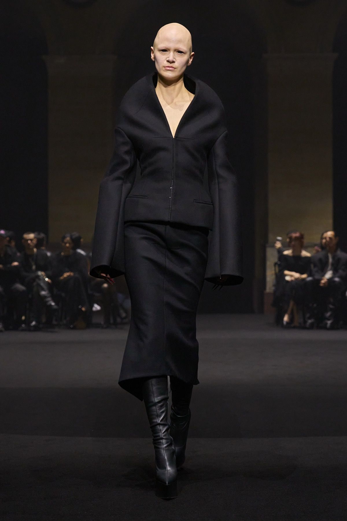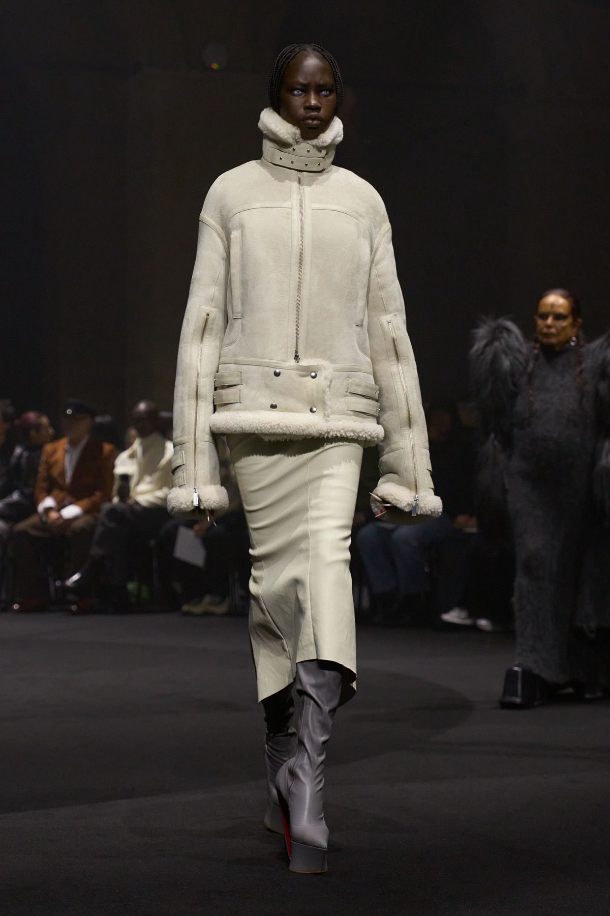 The creative duo ventures into this territory of privilege through figures such as Bryan Johnson, who does not use such tools to improve his outer shell out of vanity, but is obsessed with his inner imperfections and the extension of human life. At the opposite extreme stands Michèle Lamy, friend and Parisian mother of the brand: rebellious, she transcends time and embraces the natural beauty of aging in the most glamorous way possible, wearing ash-gray goat fur sleeves and a distorted wool knit dress.
