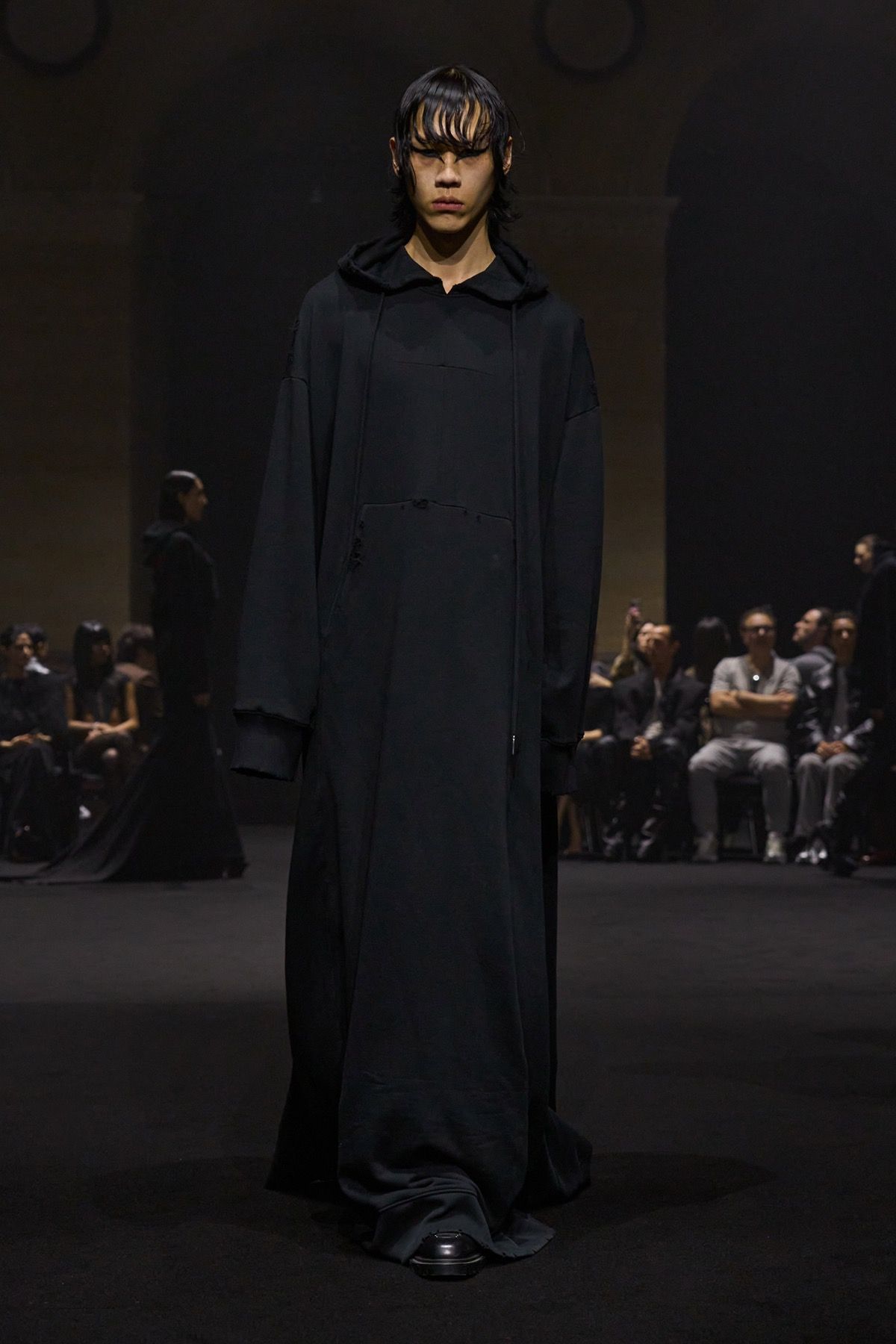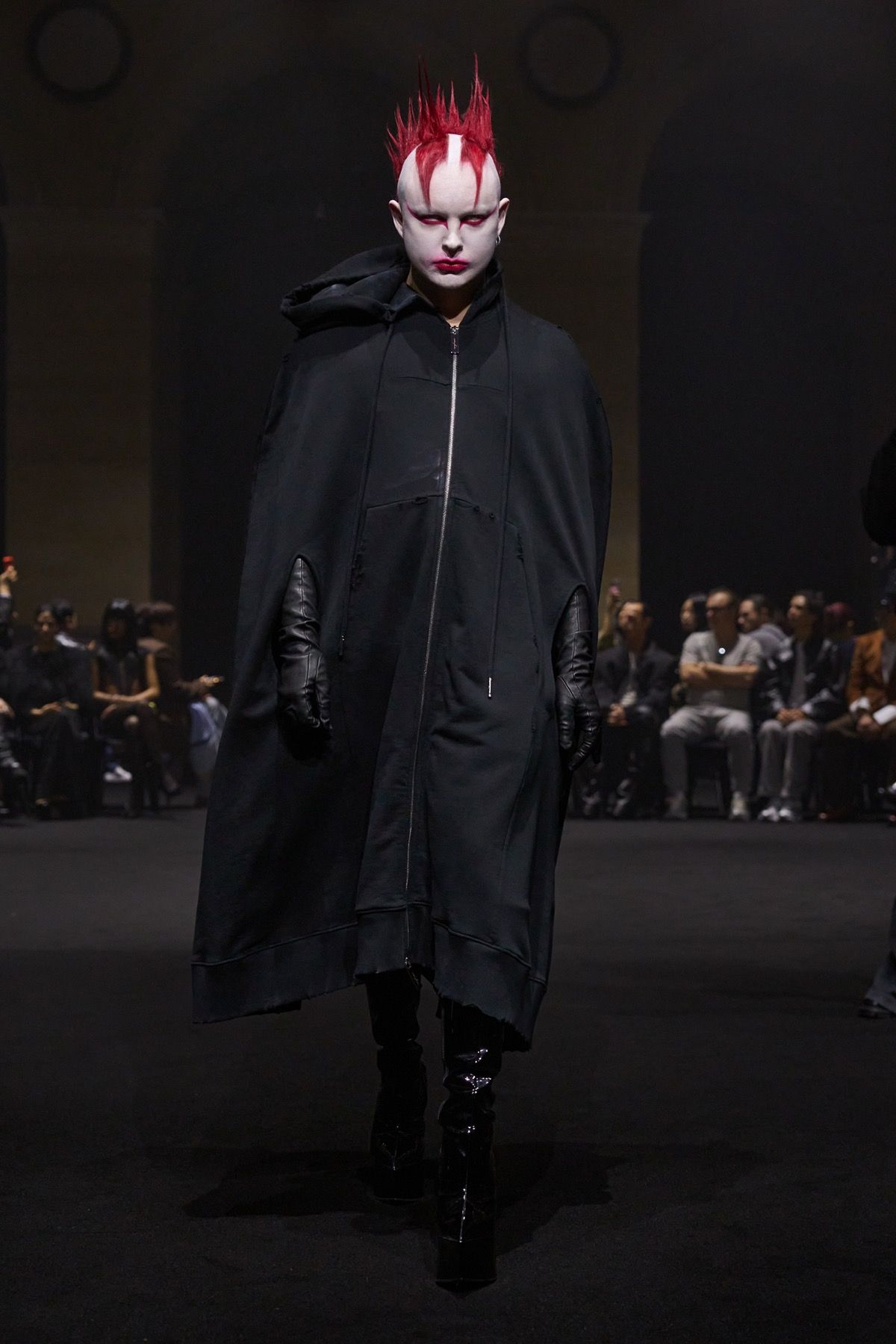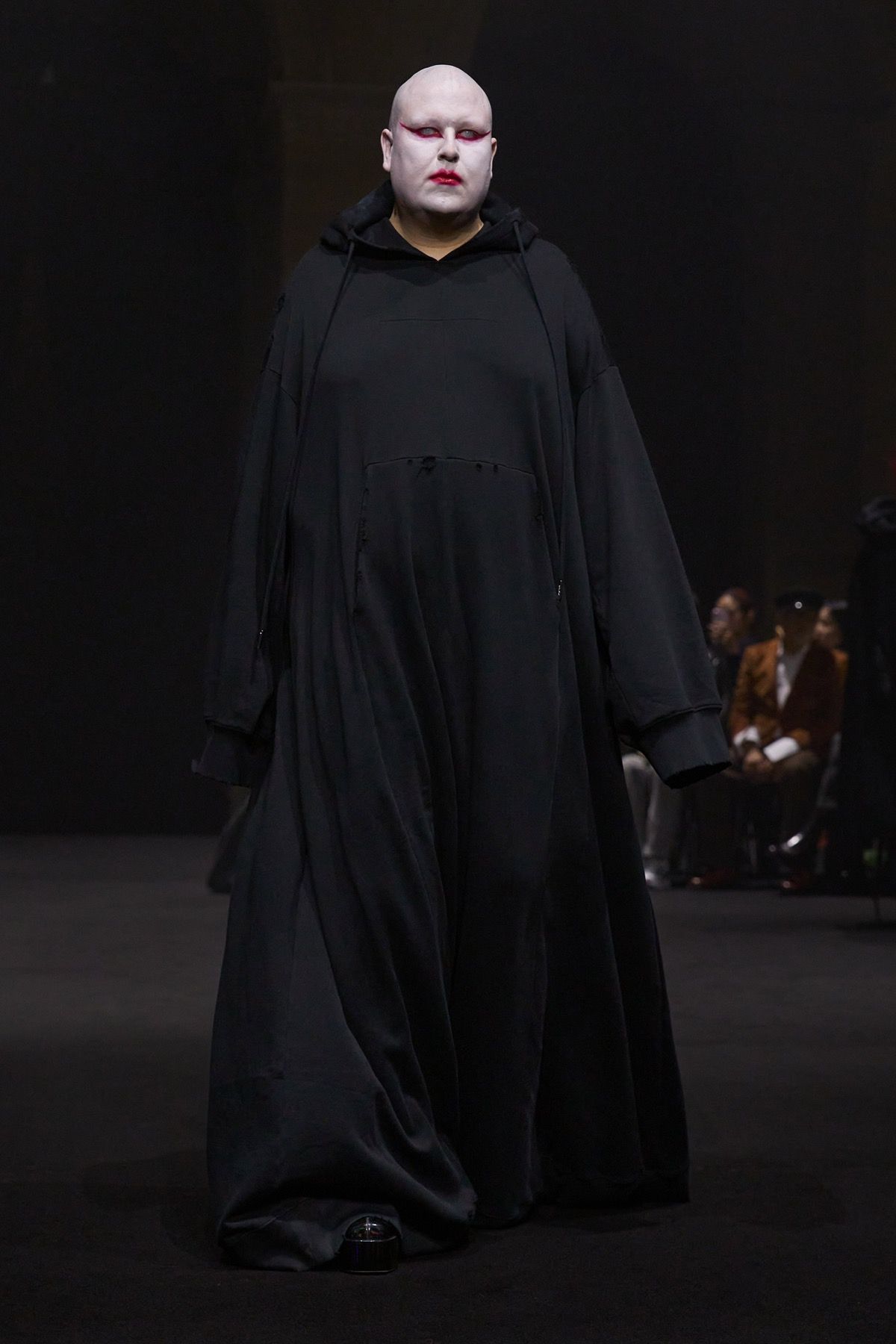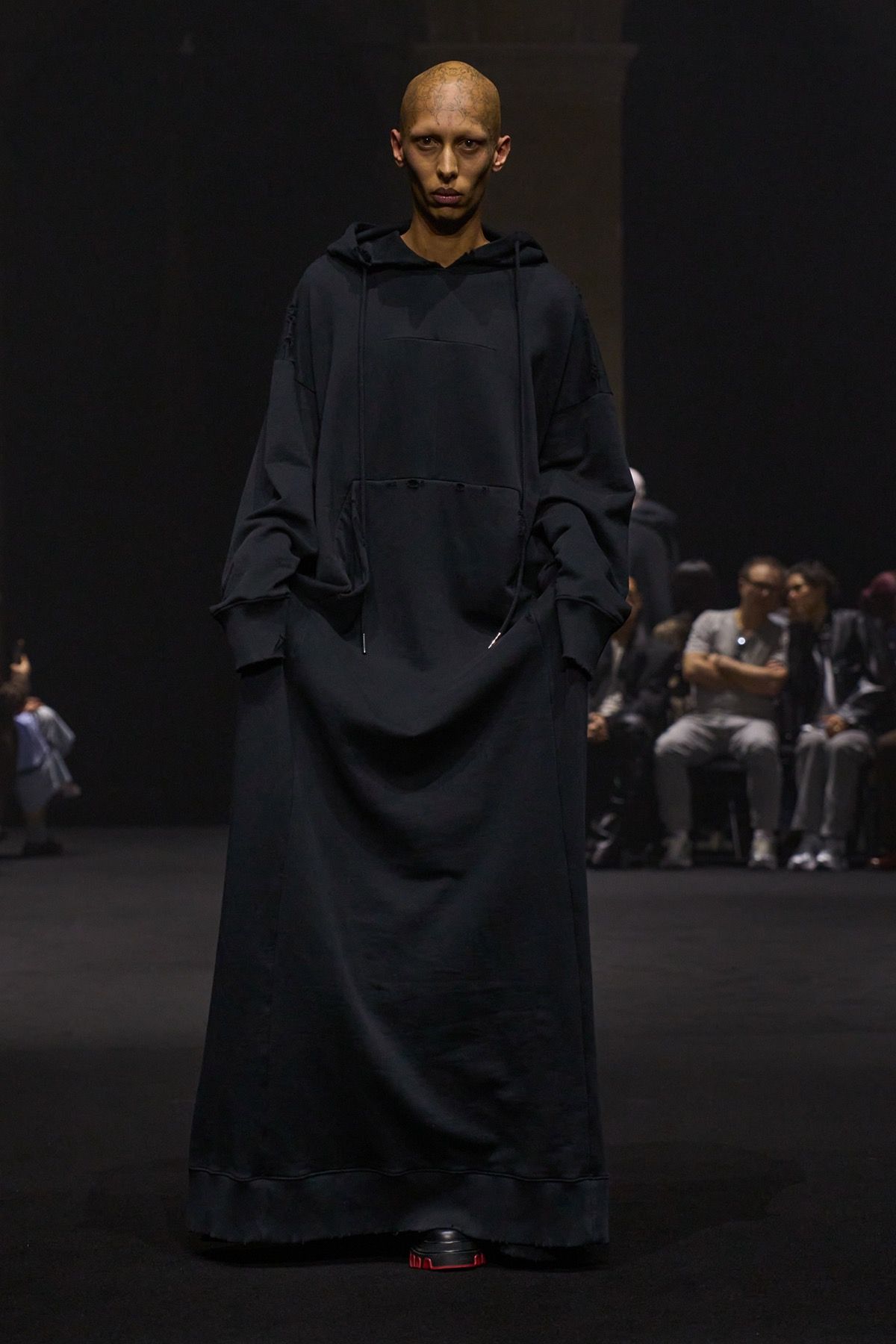 The second act of the show recalls the power of community of Matières Fécales, made up of those who share and embody its values. These translate into jersey hoodie-capes with elongated kangaroo pockets and, more broadly, into looks that oppose bourgeois energy, transforming contrast into an act of defiance against dominant norms. Wearing them are friends and family of the brand who, on this occasion, become the manifesto of a broader humanity: one that, in disturbingly conservative times, often feels fragile, if not outright powerless.