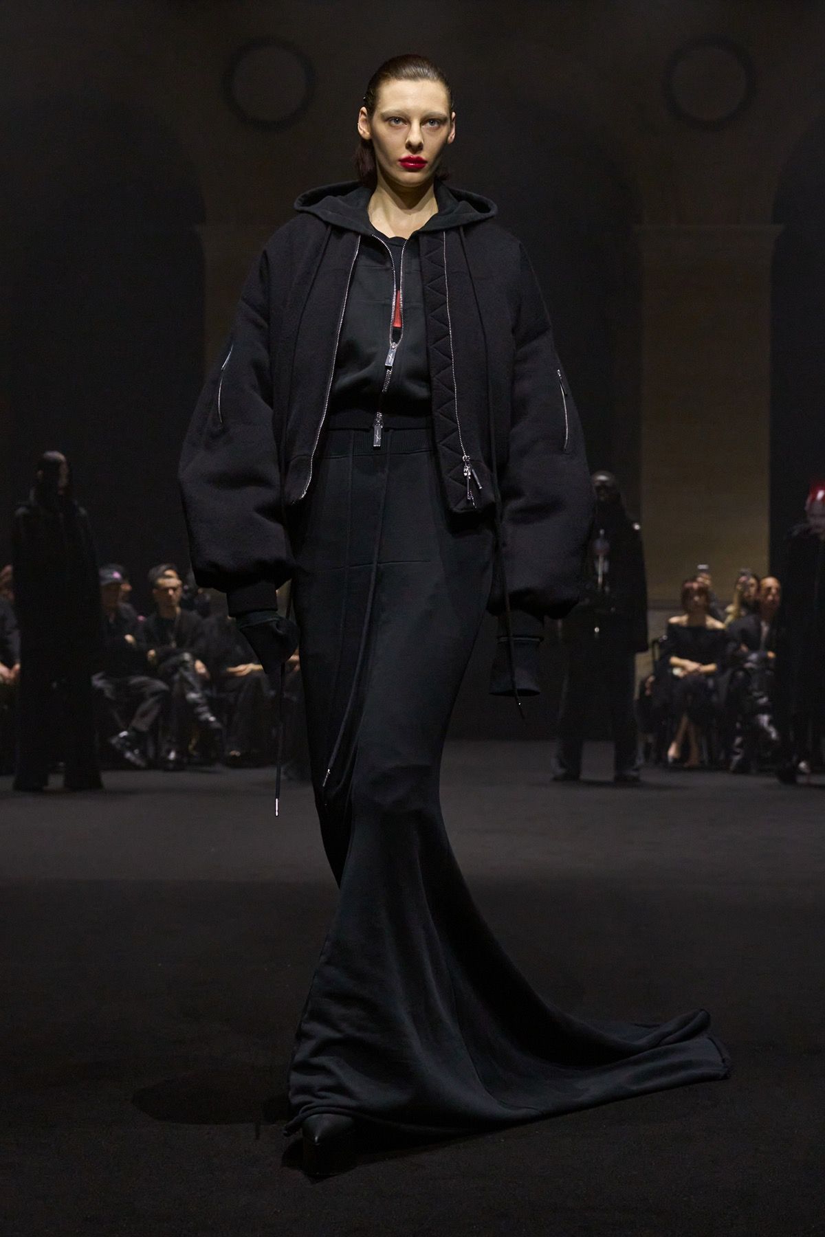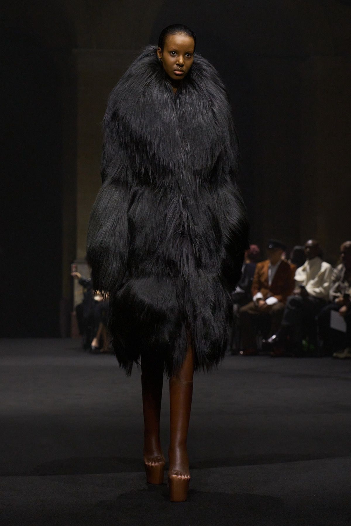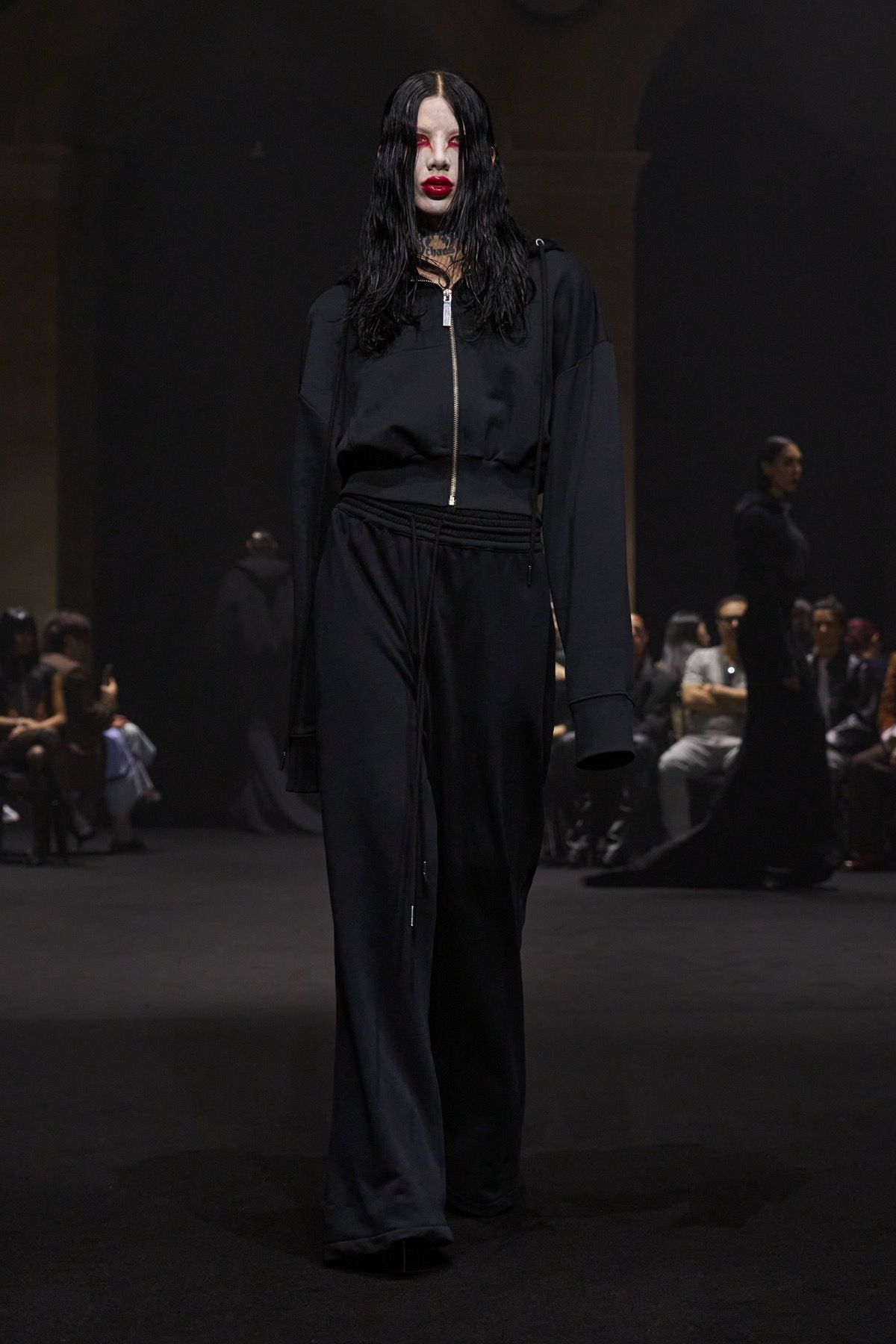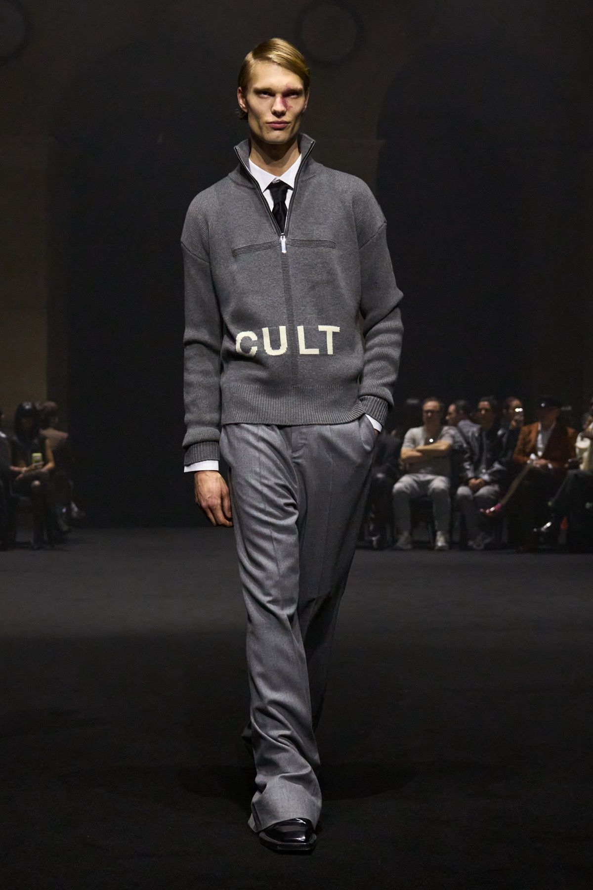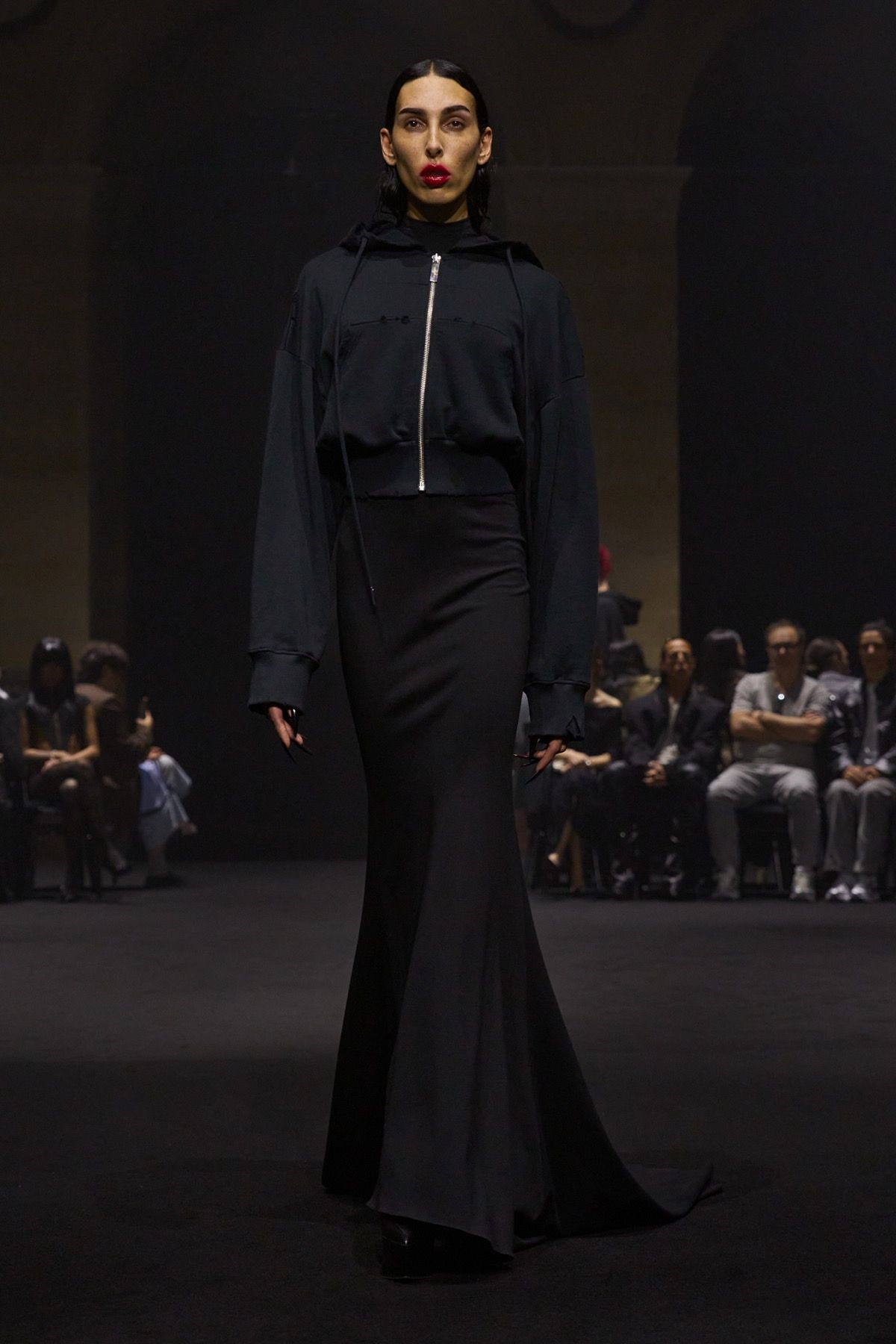 The second act of the show recalls the power of community of Matières Fécales, made up of those who share and embody its values. These translate into jersey hoodie-capes with elongated kangaroo pockets and, more broadly, into looks that oppose bourgeois energy, transforming contrast into an act of defiance against dominant norms. Wearing them are friends and family of the brand who, on this occasion, become the manifesto of a broader humanity: one that, in disturbingly conservative times, often feels fragile, if not outright powerless.