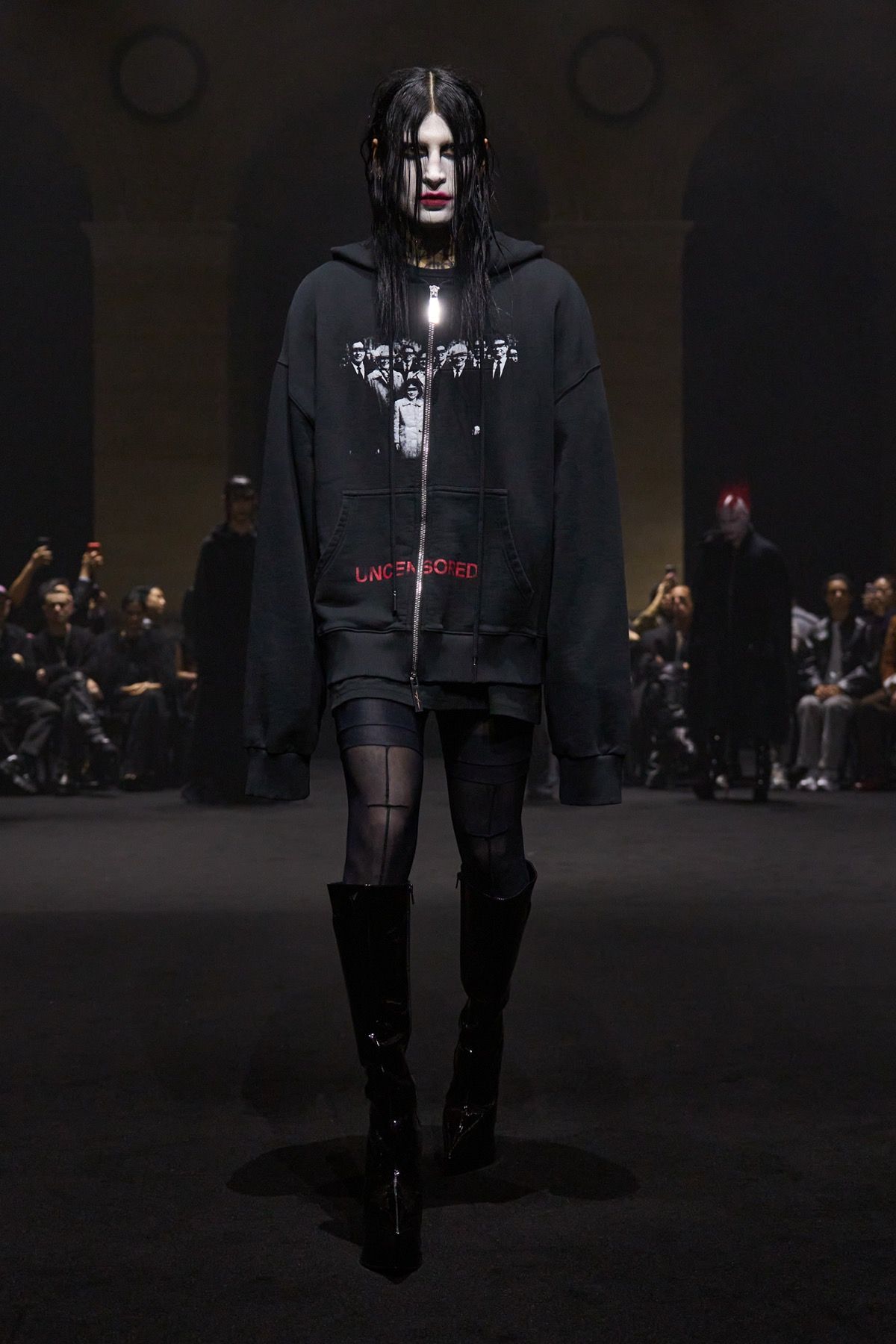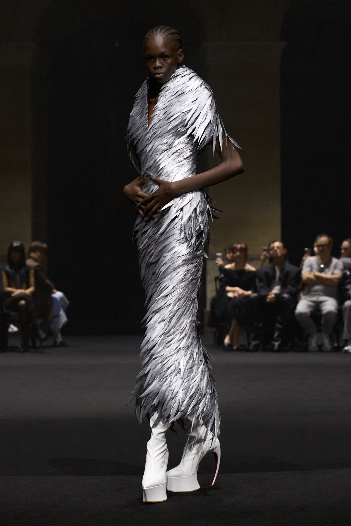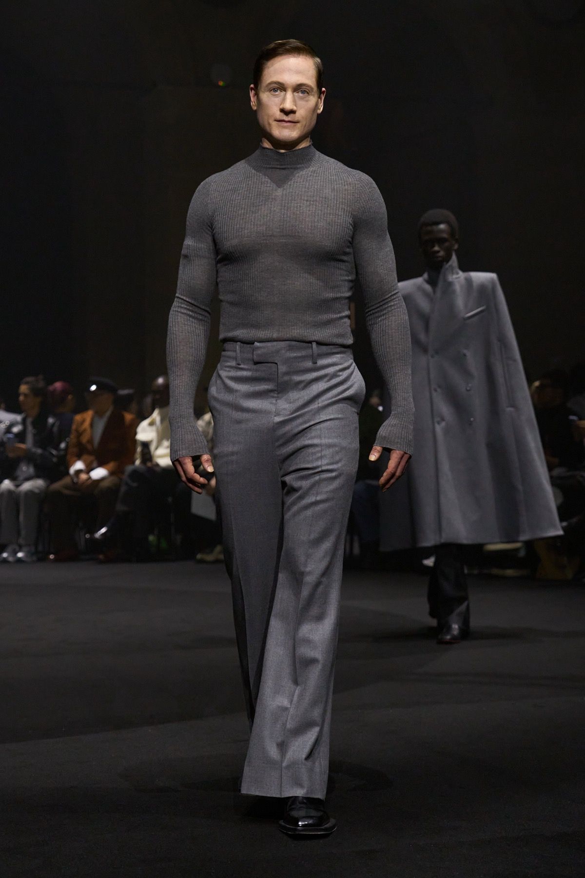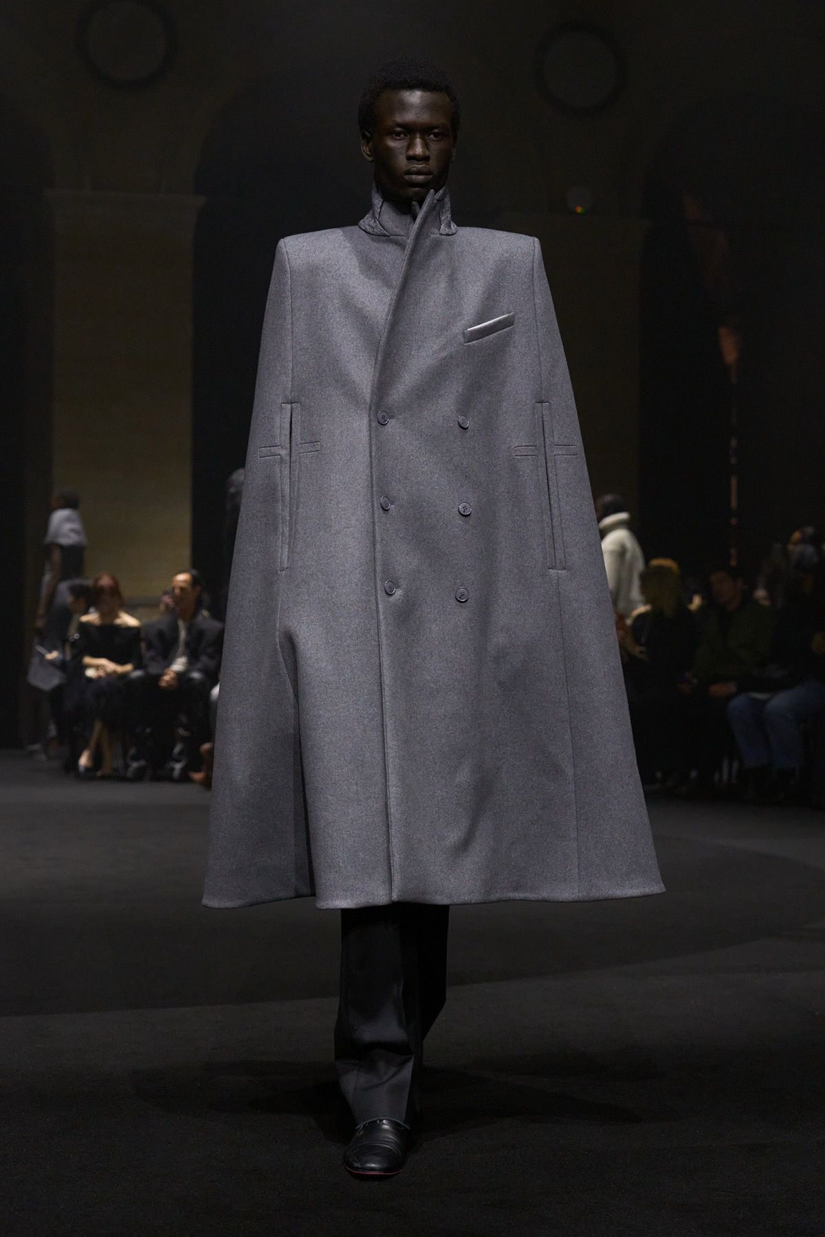 The second act of the show recalls the power of community of Matières Fécales, made up of those who share and embody its values. These translate into jersey hoodie-capes with elongated kangaroo pockets and, more broadly, into looks that oppose bourgeois energy, transforming contrast into an act of defiance against dominant norms. Wearing them are friends and family of the brand who, on this occasion, become the manifesto of a broader humanity: one that, in disturbingly conservative times, often feels fragile, if not outright powerless.