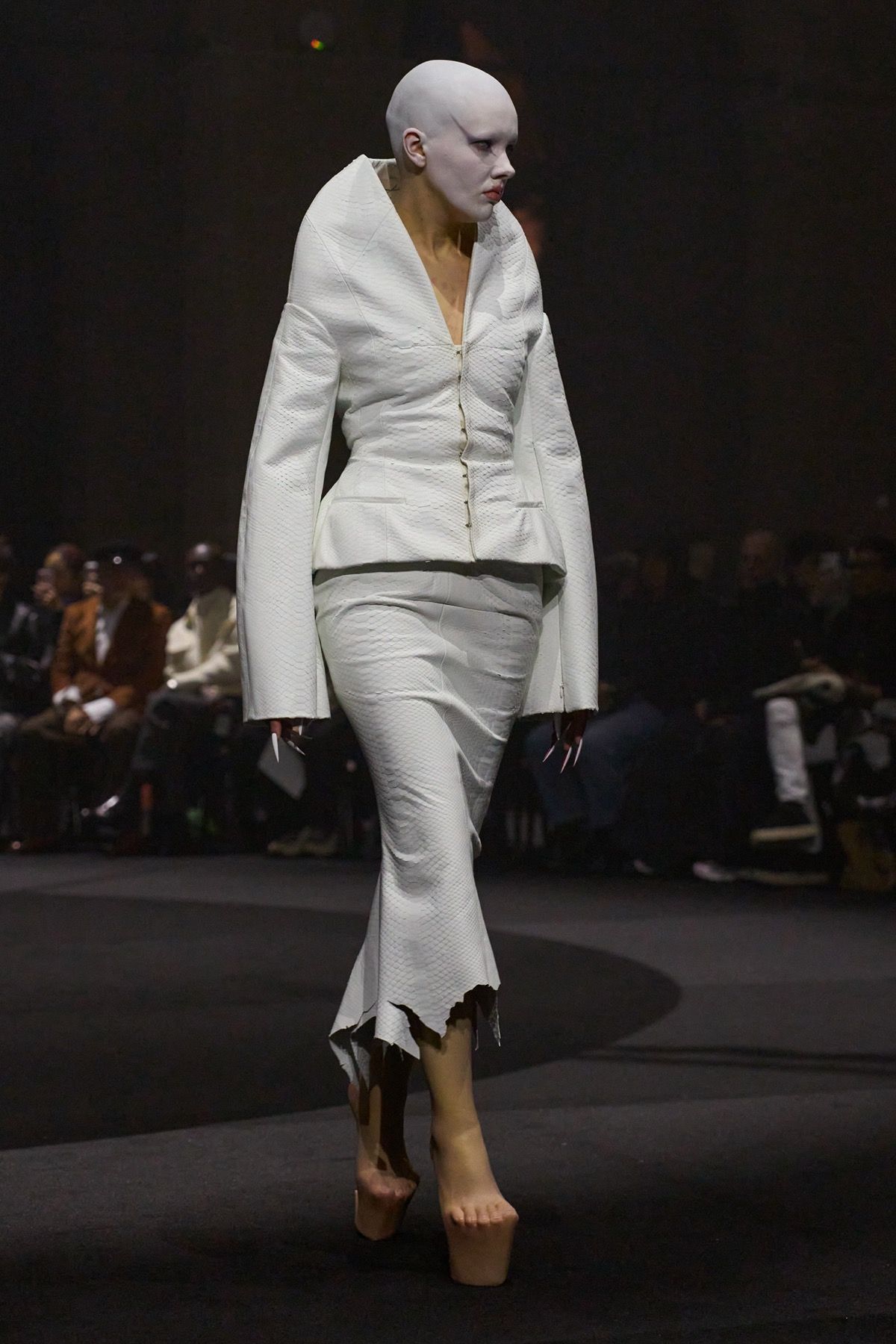 The third and final tableau, “The Immortals,” comes to life through Hannah Rose Dalton herself, who wears Matières Fécales’ New Look: a suit with an albino python cocoon skirt, rendered in the brand’s signature silhouette, paired with heelless skin boots. There is a segment of the one percent that has access to tools and life possibilities that most people do not possess.