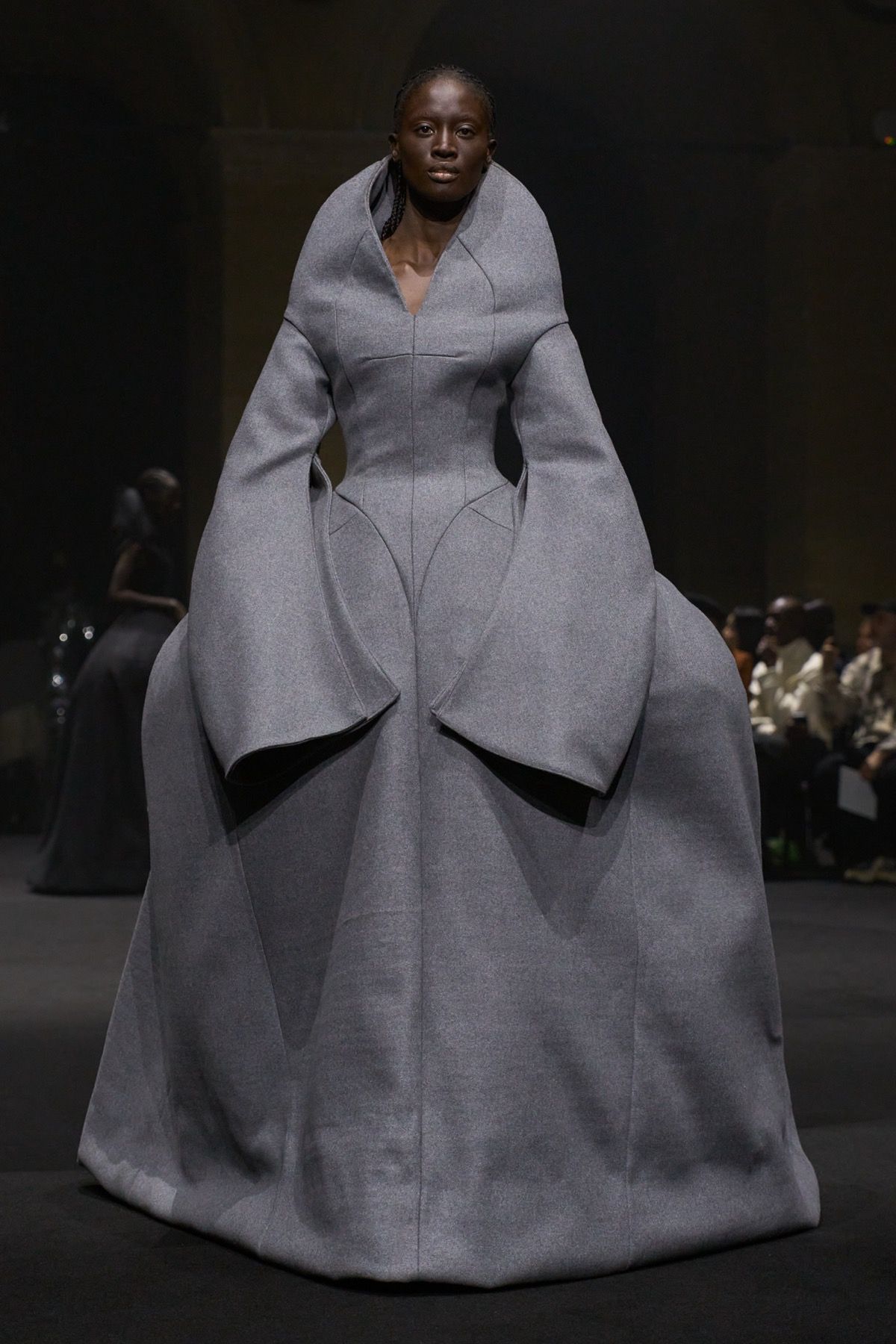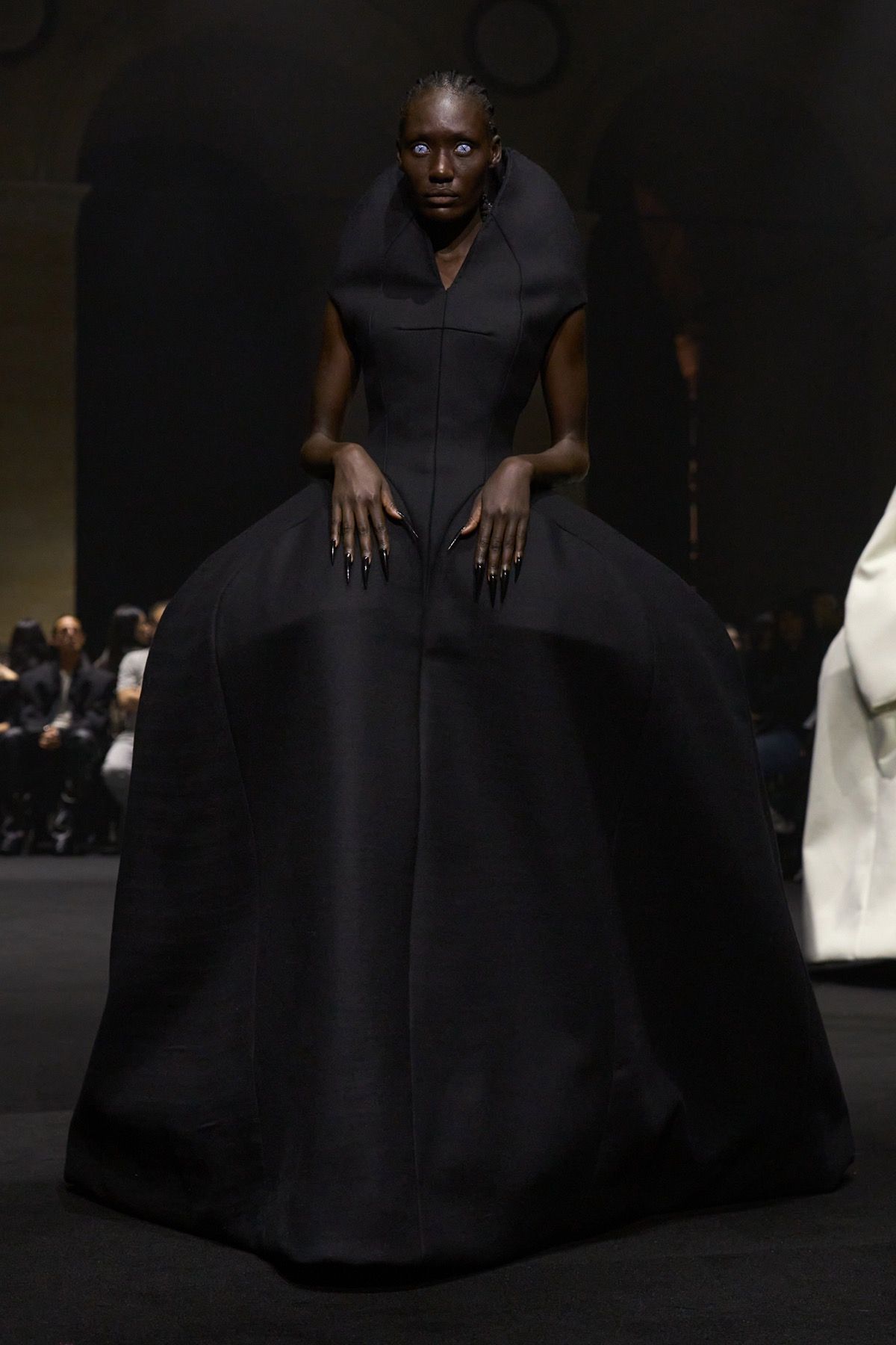 The apex of power is reached with Debra Shaw, who closes the show wearing the same look that Steven Raj Bhaskaran designed during his years of training: the interpretation of one of the most powerful silhouettes of all, that of an Elizabethan queen. An image that both crowns and seals a speculative narrative on the nature of the human being and on power, questioning how excess power can ultimately eclipse our very humanity. Perhaps Hannah Rose Dalton and Steven Raj Bhaskaran remind us of precisely this: that we are not born gods, but fallible and, at times, powerless human beings.