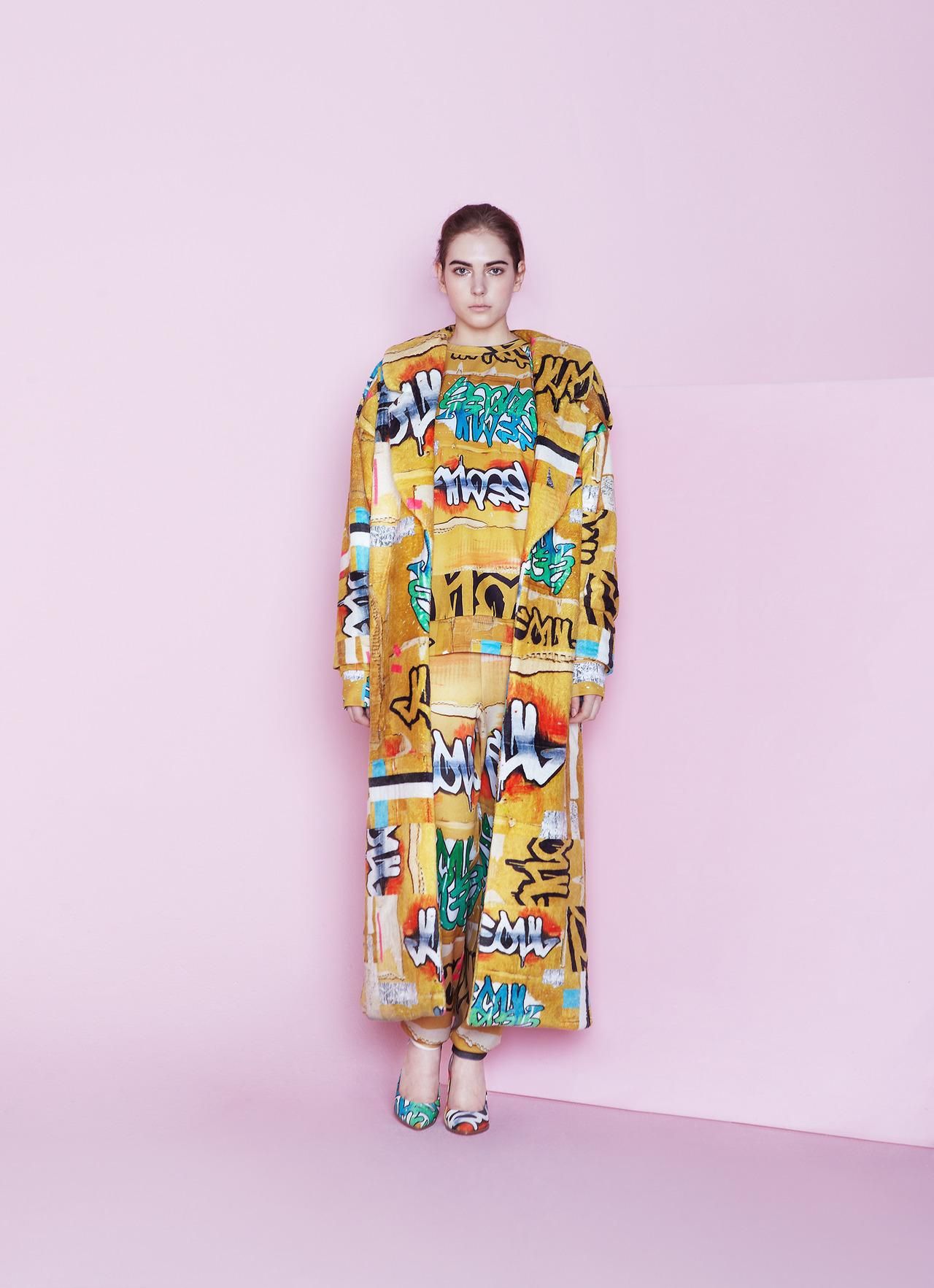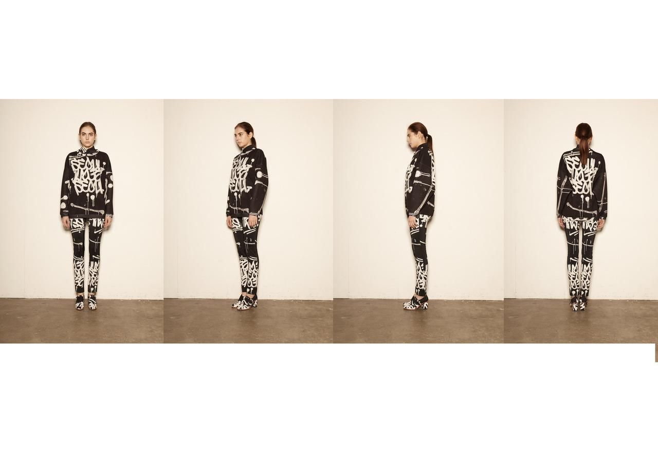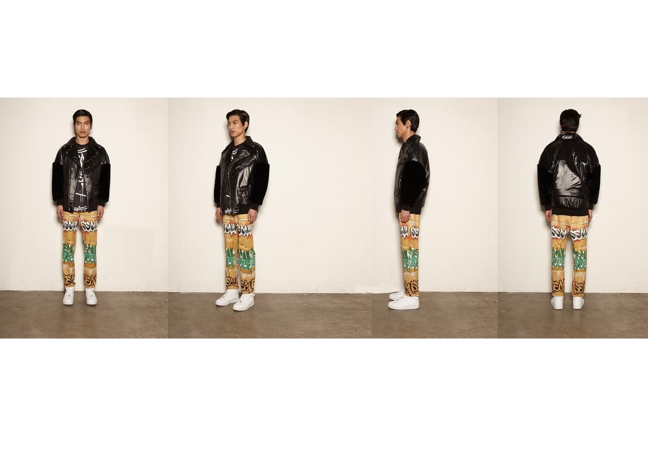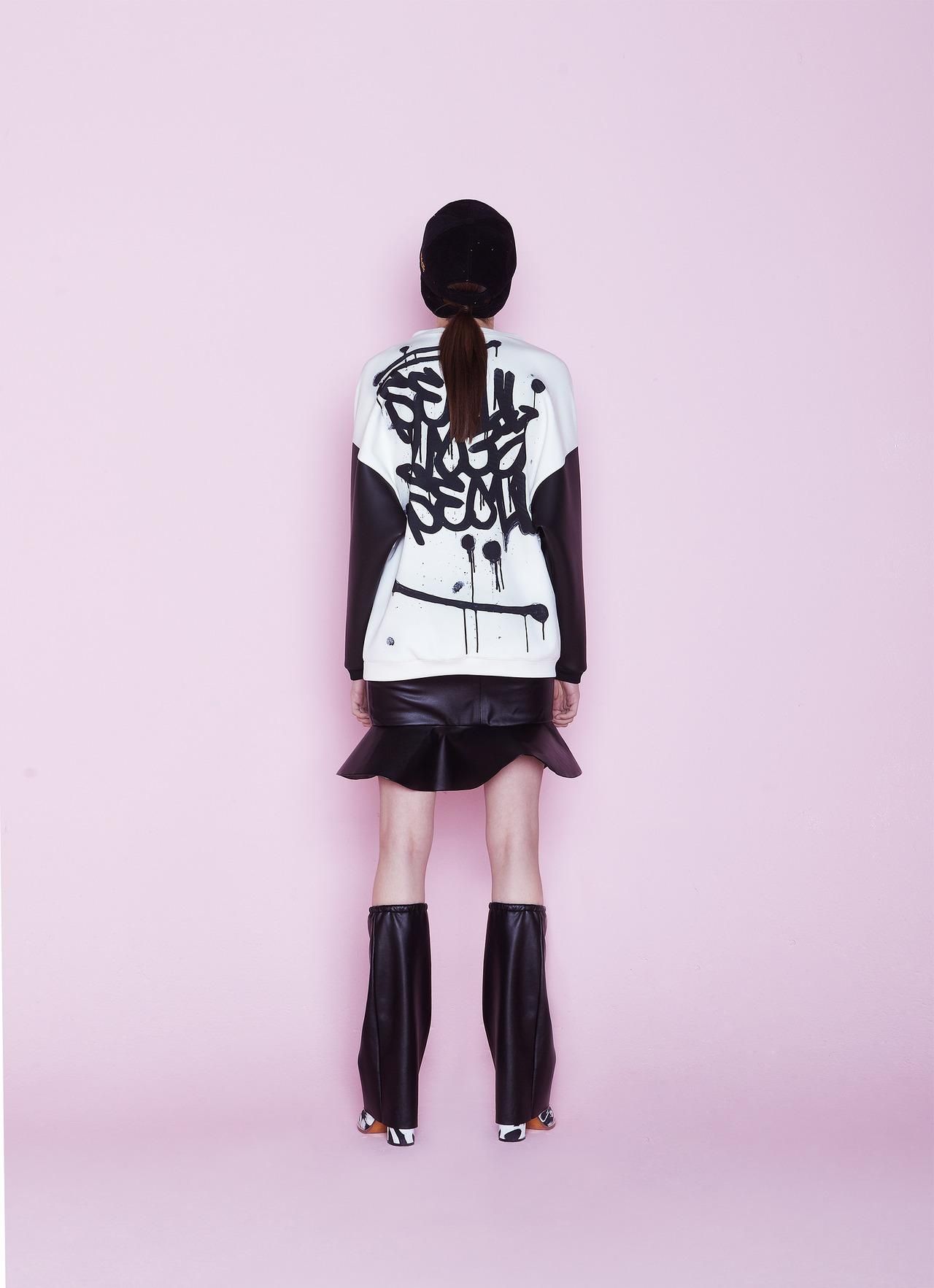 Kye’s winter collection, titled " Unemployed Youth : Homeless Youth " starts from streetwear to evolve into a contemporary, young, but more sophisticated and experimental style. Black, white, turquoise, yellow and gold are the colors that emphasize the key role of the prints, lettering, real graffiti that are a hymn to the roots of street culture, but that she trying to turn into something more complex and less immediate. To act as a counterbalance to the dry shapes, base of the collection, Kye makes leather jackets and mini quilts with important volumes that have focus on shoulders.
