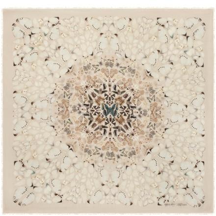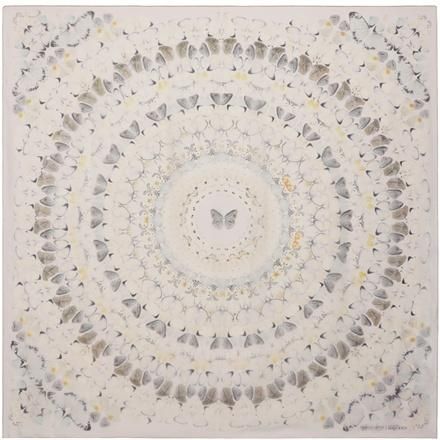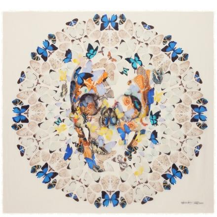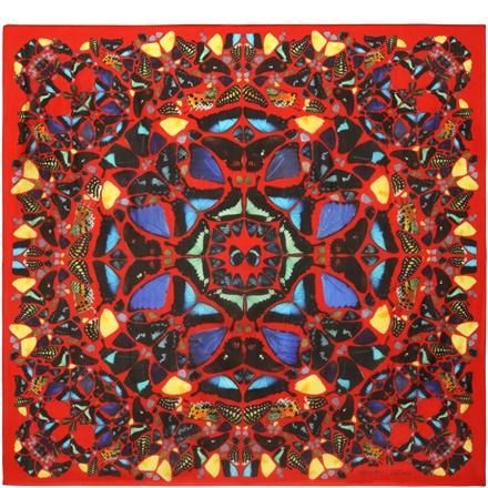 Hirst ridisegna per la famosa griffe l’iconico teschio, must have per eccellenza, realizzando una linea di foulard in edizione limitata. Trenta sciarpe incorniciate da composizioni della famosa serie Etymology di Hirst. Farfalle, insetti, ragni che creano composizioni caleidoscopiche.