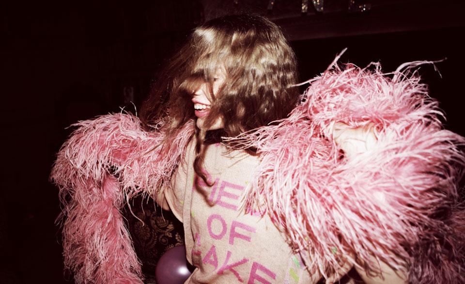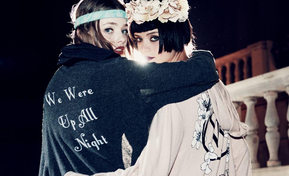 Masks, feathers, sequins, headbands, are the armor of a group of girls, shouting "Gatsby stole my heart" printed on t-shirts, they are ready to rock out at the first sign of celebration. These modern Daisy mix lace and chiffon with sequin-covered hoodies, shorts, striped pants and other street pieces. Theirs is a pajama party that lasts all night, a pastel protest against who forbids them to have fun.