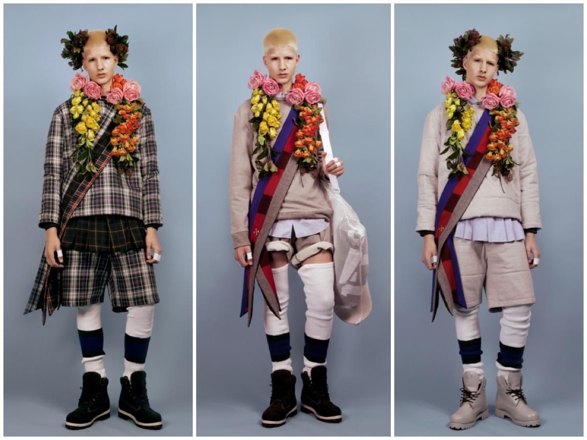 Shaun Samson, mainly working with plaid and flannel, offers a grunge style which is mitigated by a lovely detail. The faces of the models are in fact framed by flowers that create a curious contrast between the hardness of the look and the simplicity and delicacy of the nature.