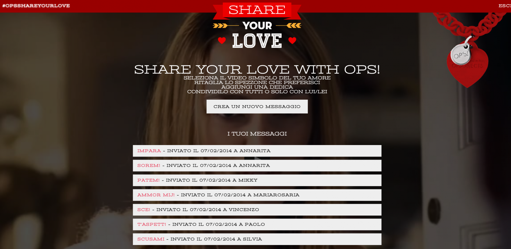 OPS! Share your love è un app interattiva creata per celebrare l'amore, quello fatto di piccoli gesti quotidiani. Un mini sito dove realizzare romantici video personalizzati da condividere con la persona che amate.