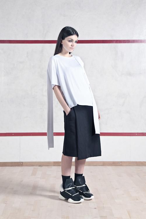 Jersey, fleece and knitwear are the raw material, the perfect tools to create garments with soft volumes, the clean lines, versatility and high level of tailoring. Each work signed Maria Sterpeta Petrovic, also SS14 proposition, it is endowed with an innate elegance. The night with its colors and moods envelops the entire collection, the prints of black & white faces, sweatshirts, t-shirts.