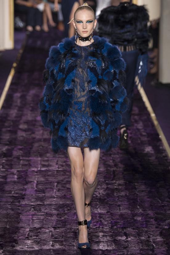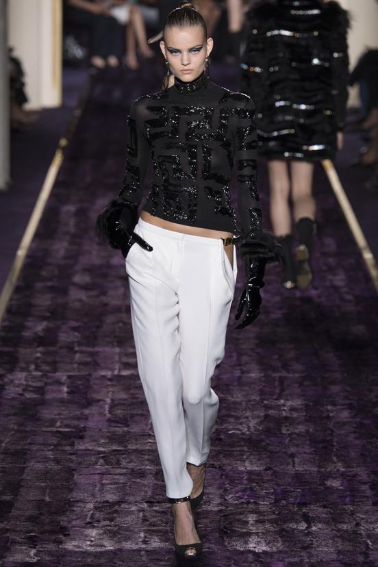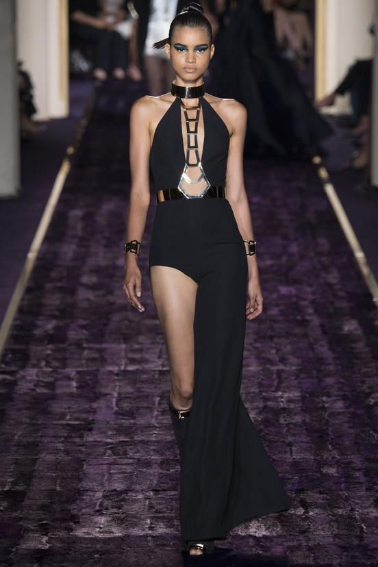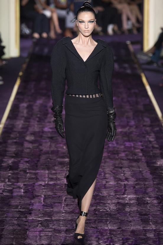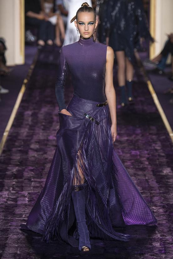 At Chambre Commerce et Industrie on a catwalk covered in purple fur lady Versace presents her personal interpretation of '50s fashions. Inguinal slits, ad hoc cuts that leave room for bare skin, with metal chains corsets, bustier dresses, draped skirts, asymmetries, ankle slim pants, even take the dresses, are decadent elements of a sophisticated, funny and sexy collection. Everything in the Versace's world exudes sensuality and glamor, even the t-shirt, covered with crystals and beads, becomes haute couture. The materials, all luxury, available in nocturnal tones such as black, purple, blue, mingle.