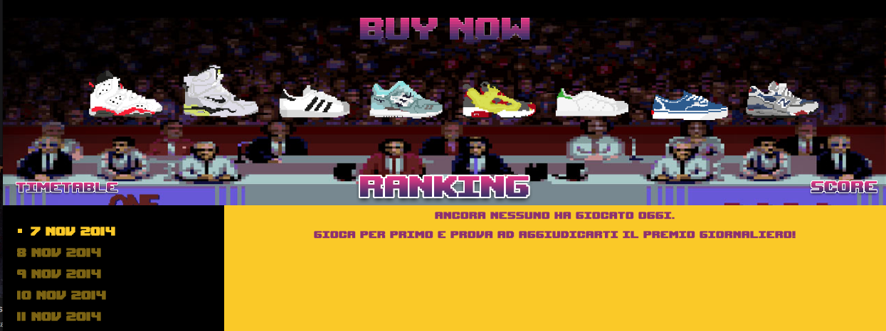 Try to turn over pairs of matching shoes and finish the Sneakers memory as quickly as you can. Go through to our scoreboard and at midnight, 1st classified will win a 30% discount voucher - valid for 48h and max on 3 products, from 8 to 22 november - on their next purchase on www.oneblockdown.it