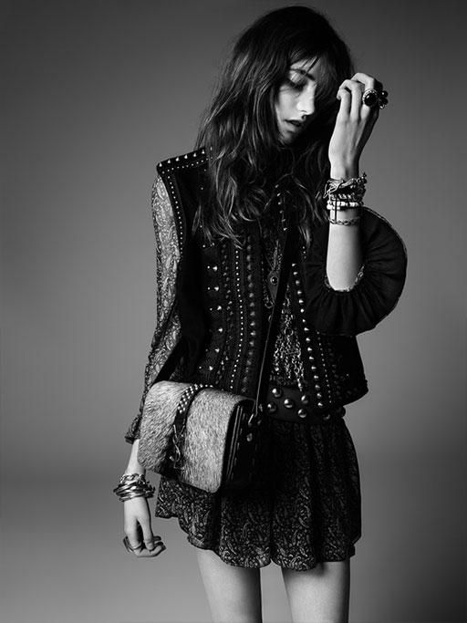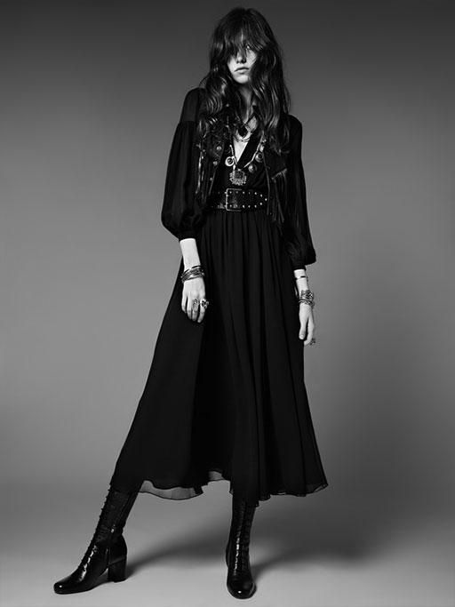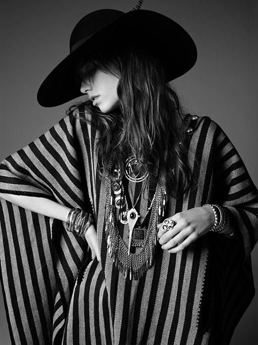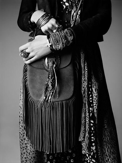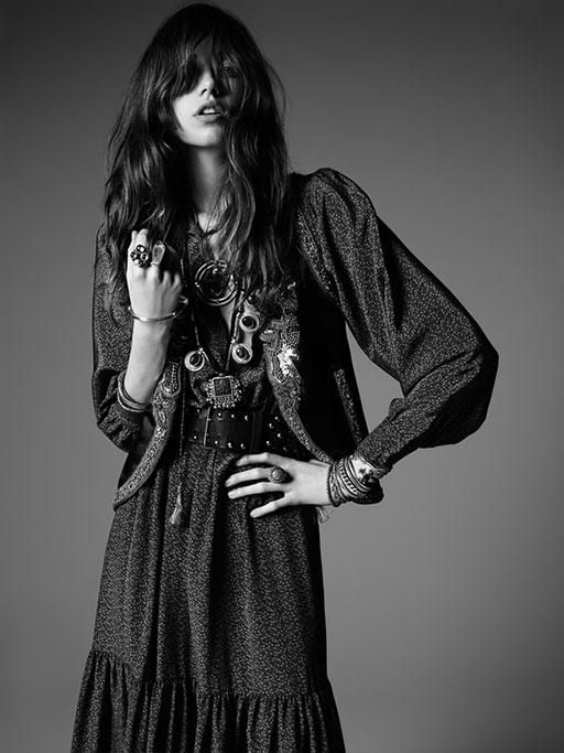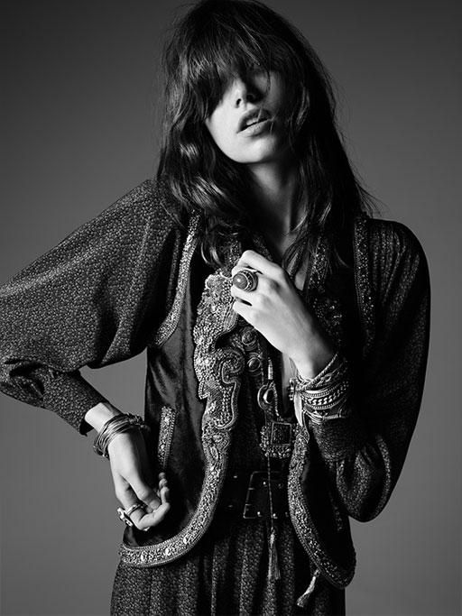 It's a fascinating gypsy who moves to the beat of a hypnotic psychedelic folk, a nomad who wears beautiful caftans see-through, long dresses animal, jackets with fringe, brocade tuxedo jackets, patchwork motifs, boots, jewelry and important.