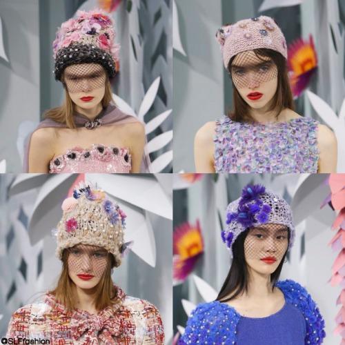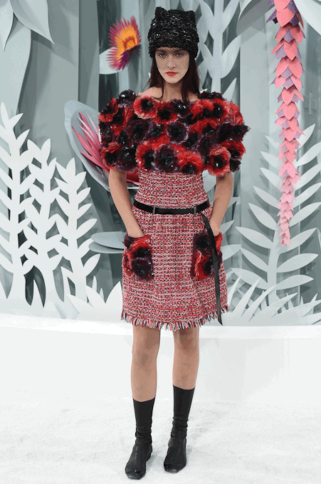 Inside the Grand Palais lies a dormant garden of 300 white flowers, carved in metal, awakening by the passage of a magical gardener in overalls and armed with a watering can. All of a sudden the hi-tech bends to poetry and the petals of these tropical plants bloom, coloring the environment of pink, apricot, yellow. It's a feast for the eyes, a romantic and sensual world, born from the imagination and from the work of Karl Lagerfeld and his staff. In this synthetic paradise move Chanel girls, wrapped in their sorbet suit.