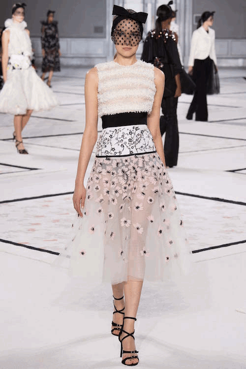 With these words, Giambattista Valli tells his couture collection, a dialogue between two icons free and revolutionary, between Janis Joplin and Coco Chanel. In a sumptuous hall of the Grand Palais, under a sky of mirrors, between flowering hedges, an enchanted atmosphere and suspended welcomes pastel tones, clouds of fine fabrics, large volumes, the ripples of ruffles, embroidery three-dimensional.
