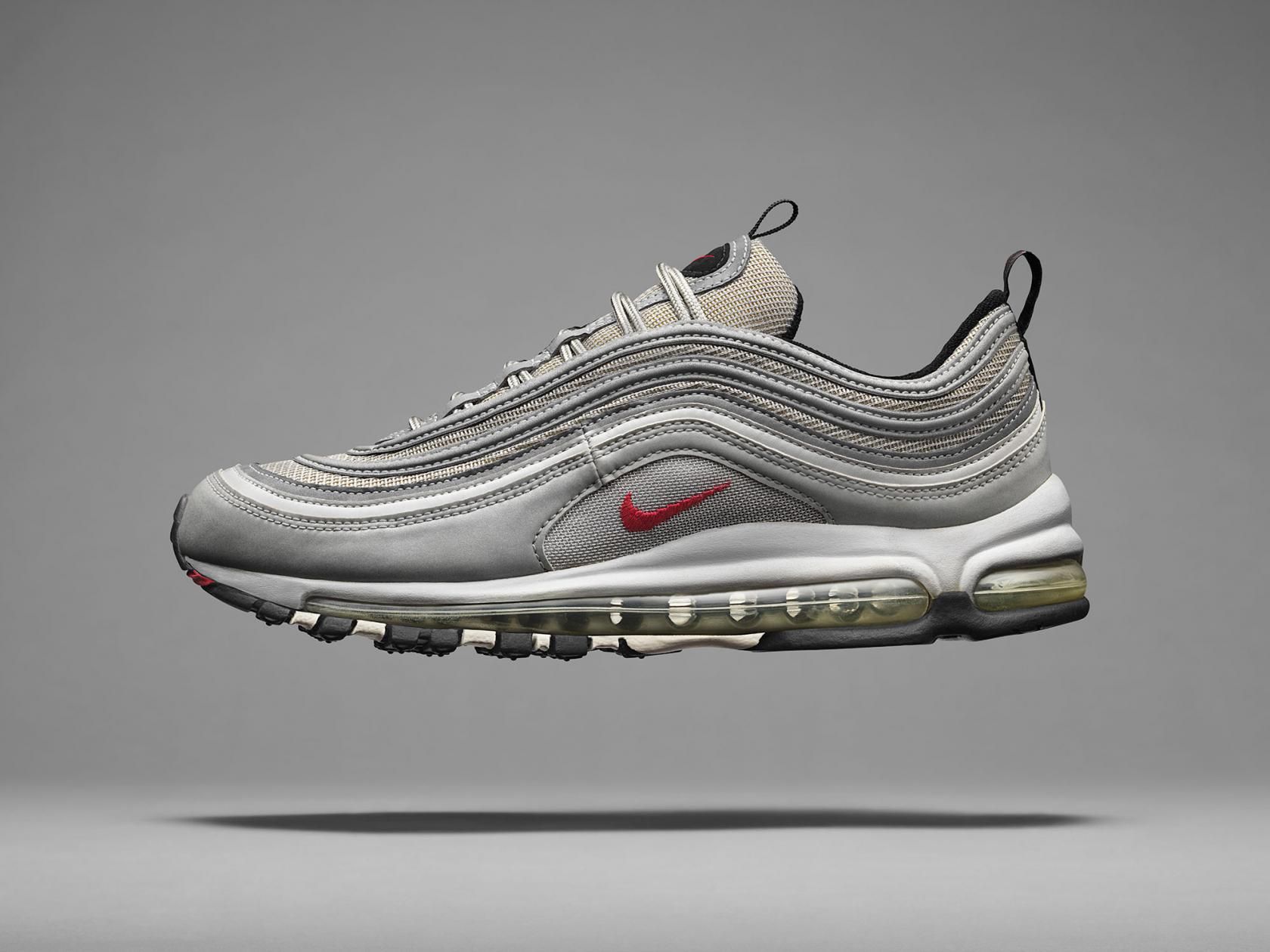 As if it were challenged by the Air Max 95’s forefoot visibility, the Nike Air Max 97 answered by providing the first full-length Max Air unit. Naturally, something this groundbreaking needed an upper to match the audacious innovation. Starting with silver, the fluid design took inspiration from Tokyo’s lightning-fast bullet trains, while reflective piping gave the Air Max 97 a look that amplified in the right light. The perfect shoe for a period of anti-subtlety, where more mattered in music, movies and style, has since become a design classic that defines its time.