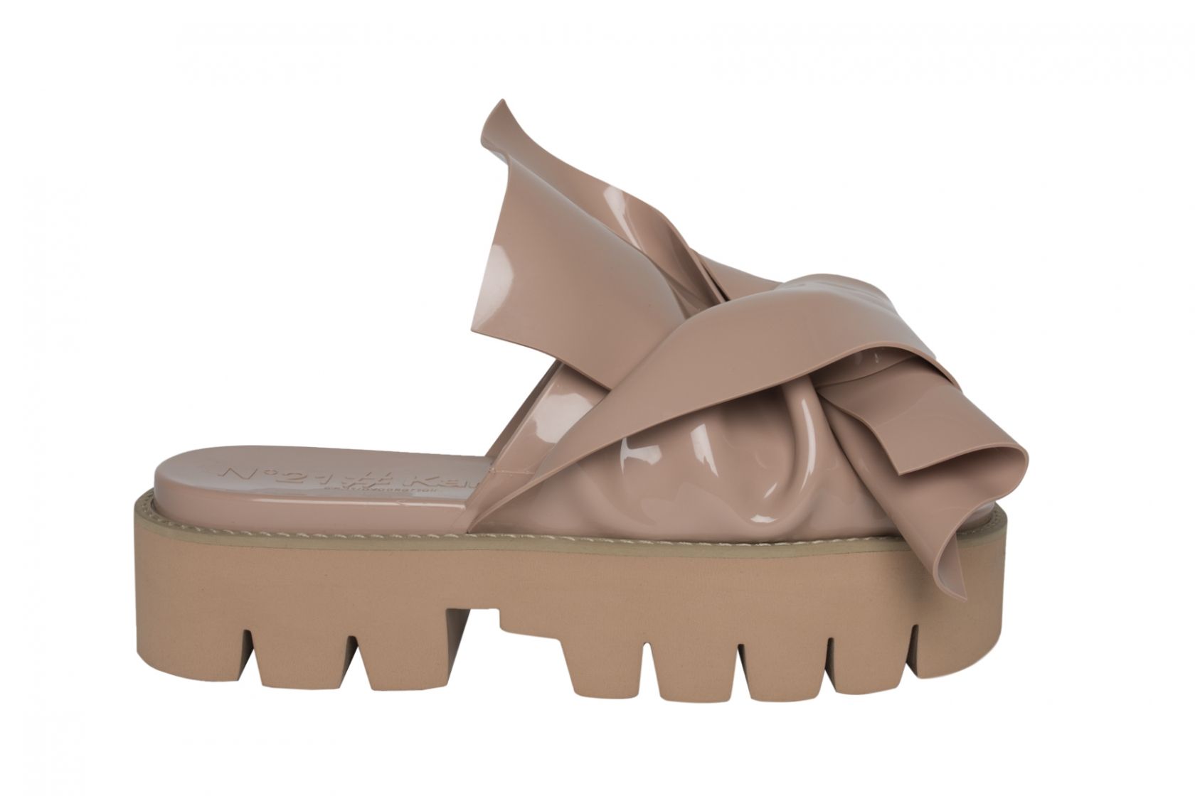 The shoe, which presents the heavy-duty para sole and the iconic N°21 bow, is made of hard glossy plastic and is available in five shades: black, dusty pink, mustard, khaki and Bordeaux. Made in Italy power.