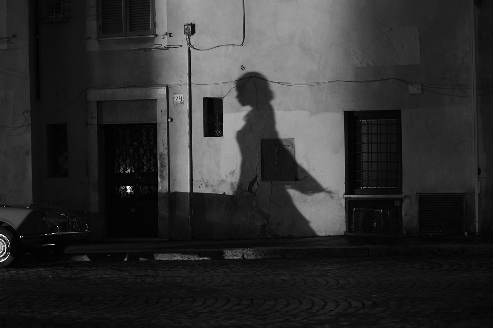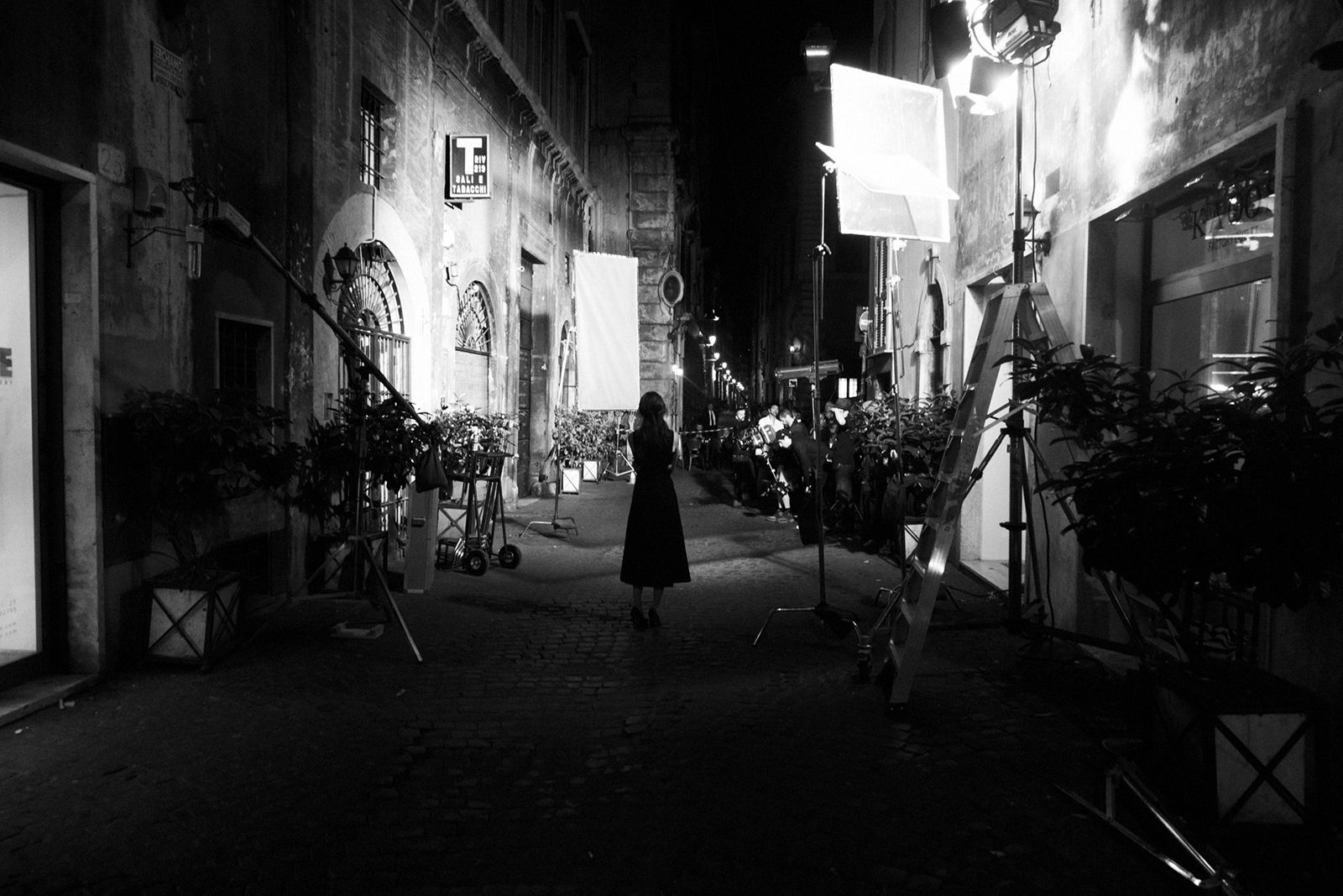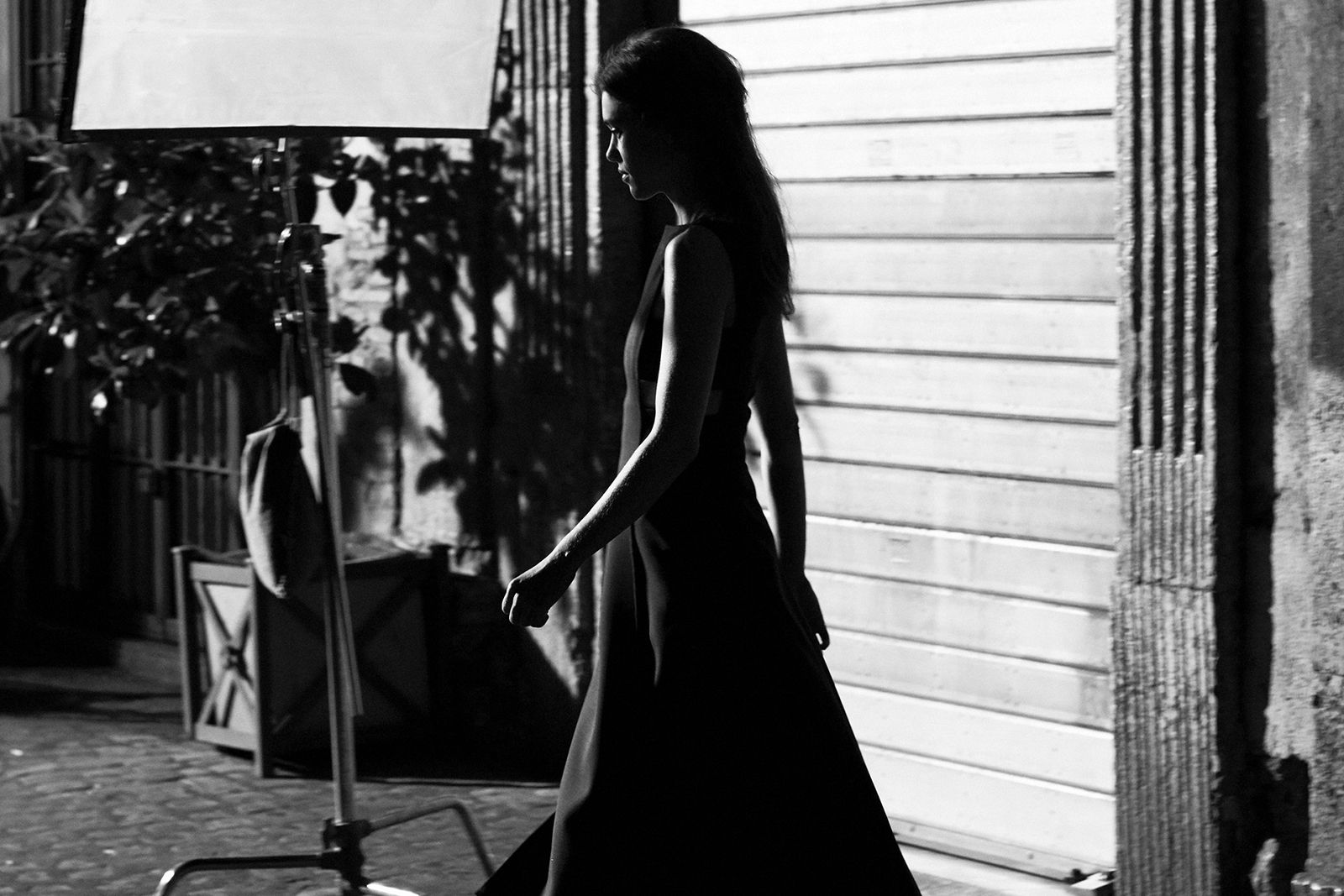 Valentino’s Rome is not monumental: it is a complex, angular, surprising and modernist city, as if filtered through a cinéma vérité lens. Astrid is the perfect protagonist of this paiting, with her classic features and intense look.
