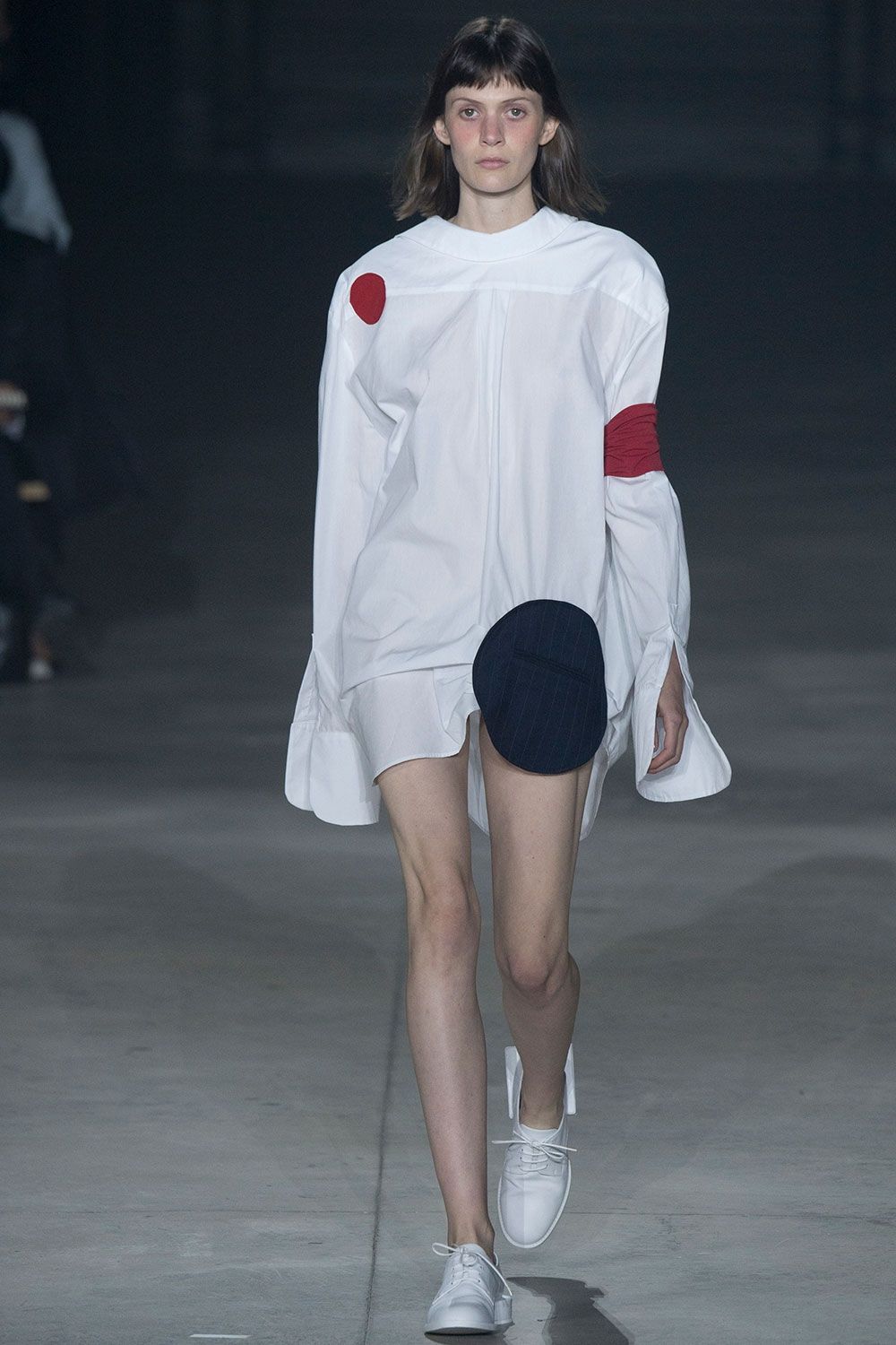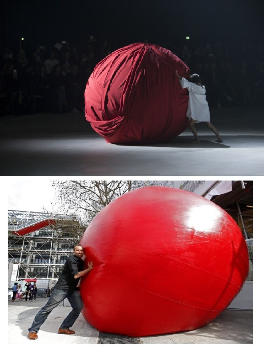 The designer enters the scene with a horse, both in white, followed by a child, Simon's cousin, pushing a giant ball of red fabric. Then the models, bizarre creatures dressed with lines, circles, patchwork of fashion and feelings.
