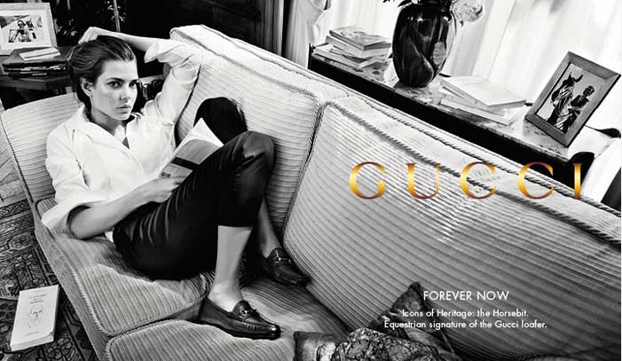 2012: Forever Now. Gucci celebrates the iconic pieces of the brand. Frida Giannini chooses Peter Lindbergh as photographer and Charlotte Casiraghi as muse.