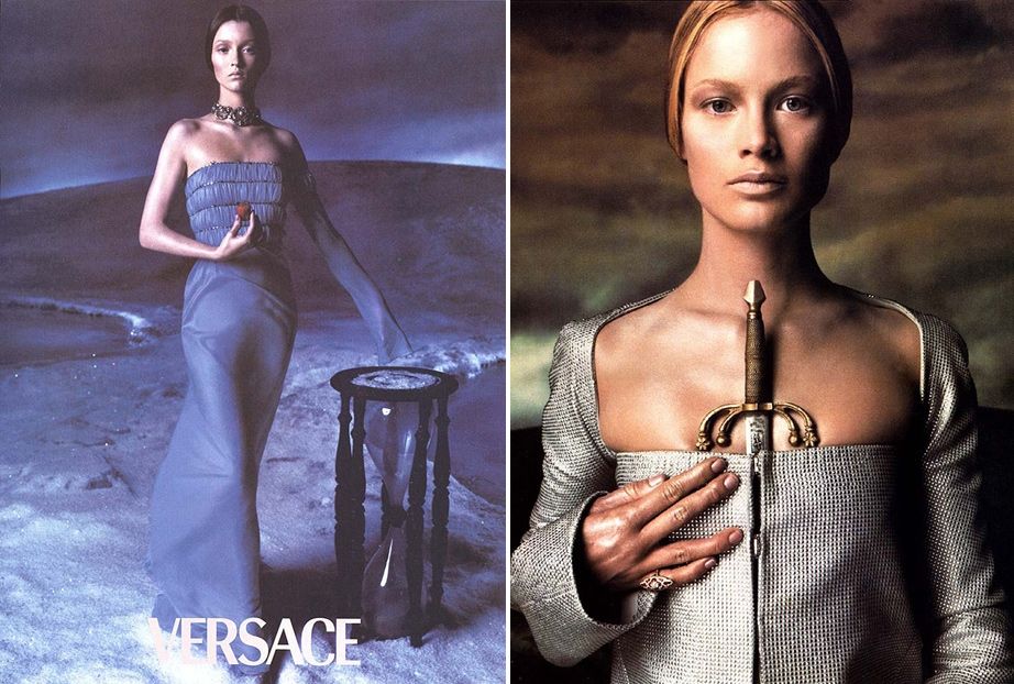 AW98: Versace meets Games of Thrones. Steven Meisel paints a Gothic story with knights, witches, priestesses, crows, books and swords.