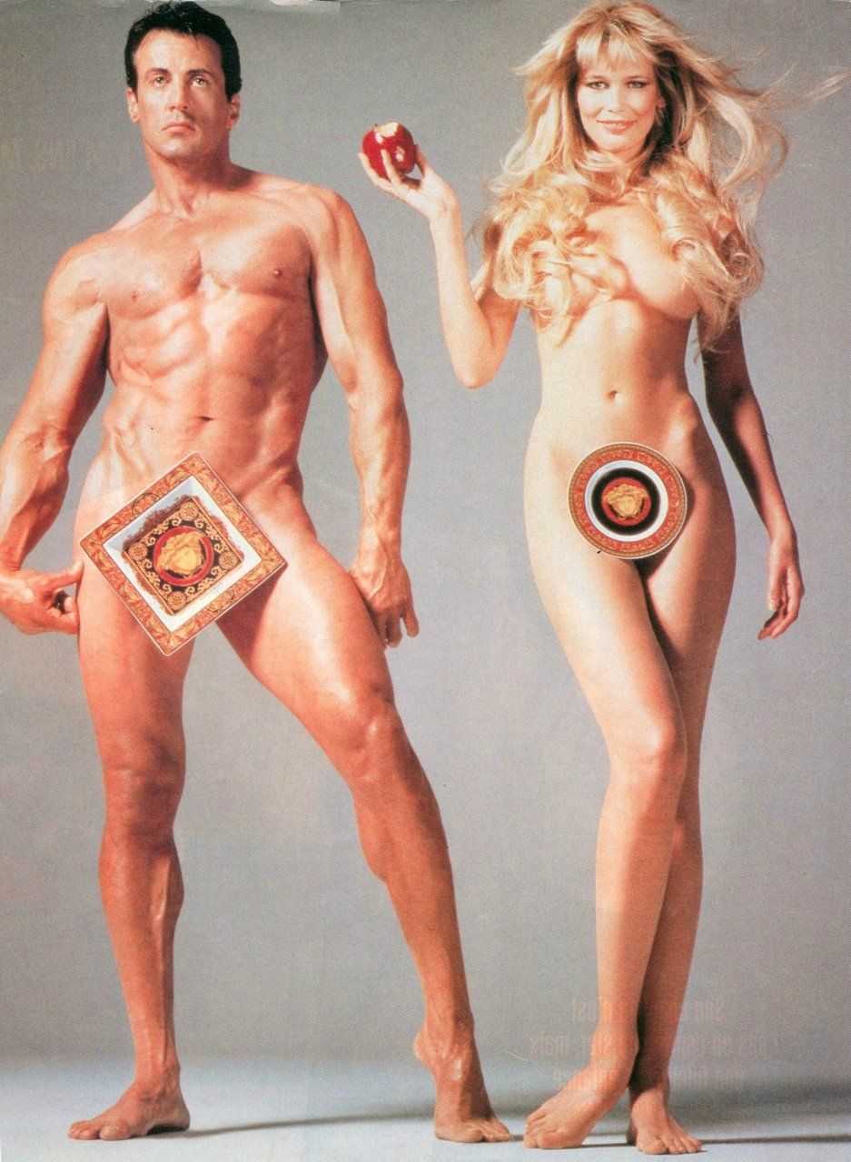 SS95: Adam and Eve. Sylvester Stallone and Claudia Schiffer interpret the couple of Eden for photographer Richard Avedon. The advertising campaign for Versace Home also includes Naomi and other naked beauties.