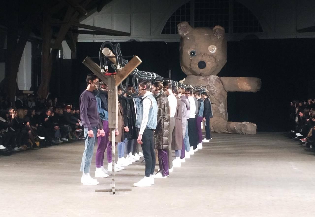 #2 Han Kjobenhavn Fashion Show - Wednesday February 3 @ Den Grå Hul, Maelkevejen 63. The Danish brand presented another fantastic show, where a group of models wore menacing masks walking on a dusty runway with a soundtrack created by pounding drums. The models were then lined up in front of a huge plush bear.