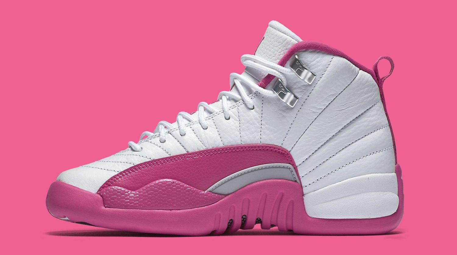 The Air Jordan 12 classic silhouette becomes super feminine for this exclusive girl edition in vivid pink. The shoe is characterized by a white leather upper which contrasts with the vivid pink of the traditional side panel that drops on the intersole, metallic upper eyelets complete this feminine look.