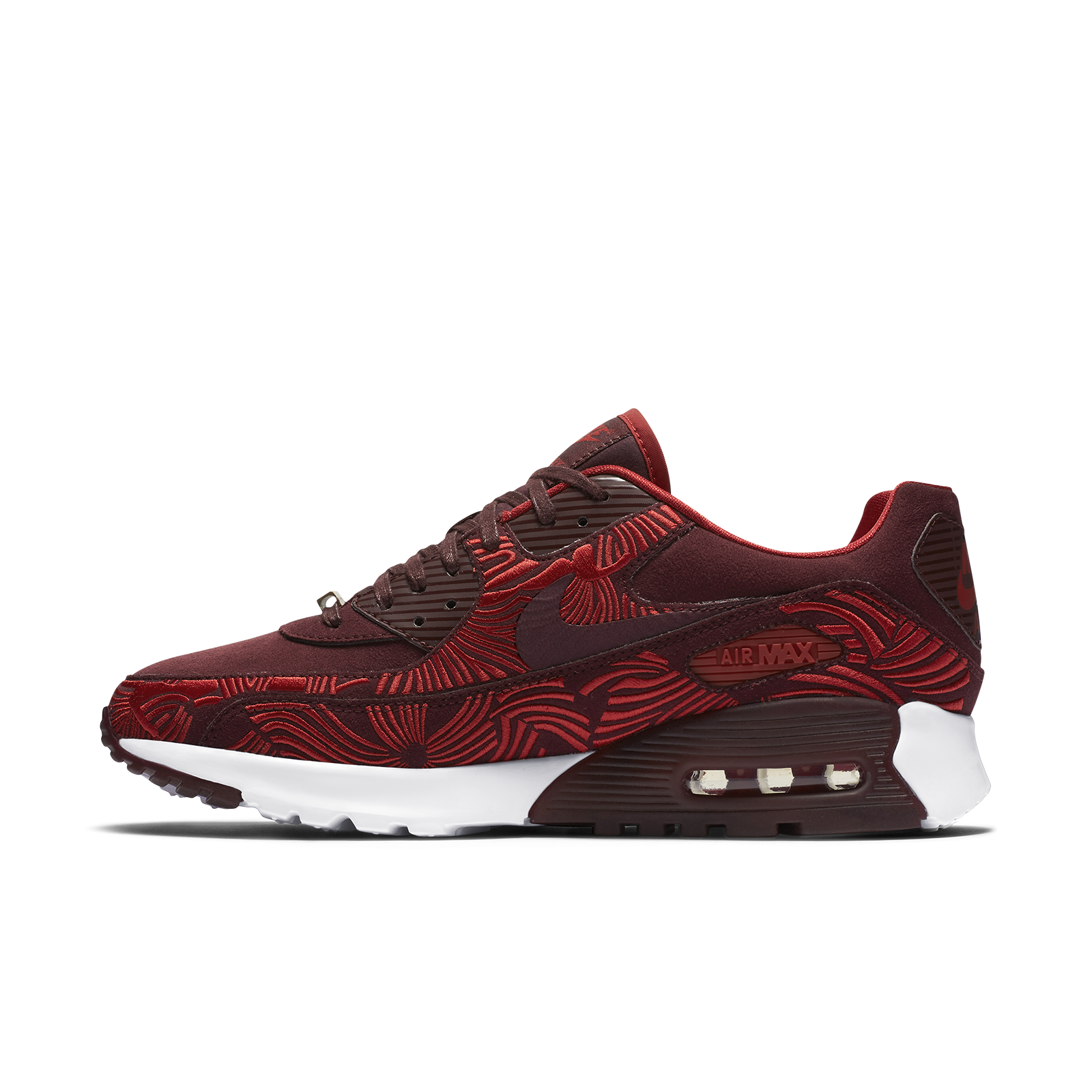 The pattern in bright colors - such as red and burgundy - chosen for the silhouette of the Air Max 90 Ultra, is inspired by classical architecture and Chinese fabrics honoring the vibrant city of Shanghai. It will be available on nike.com on March 17.