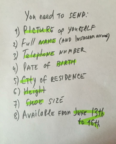 The news was launched yesterday on the designer's official Instagram account (then removed few hours after the publication) through a simple to-do list with the instructions to take part in the casting.