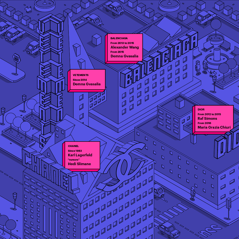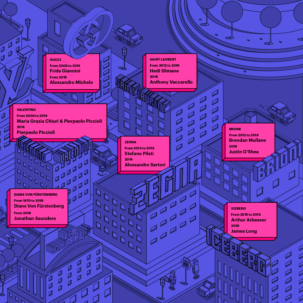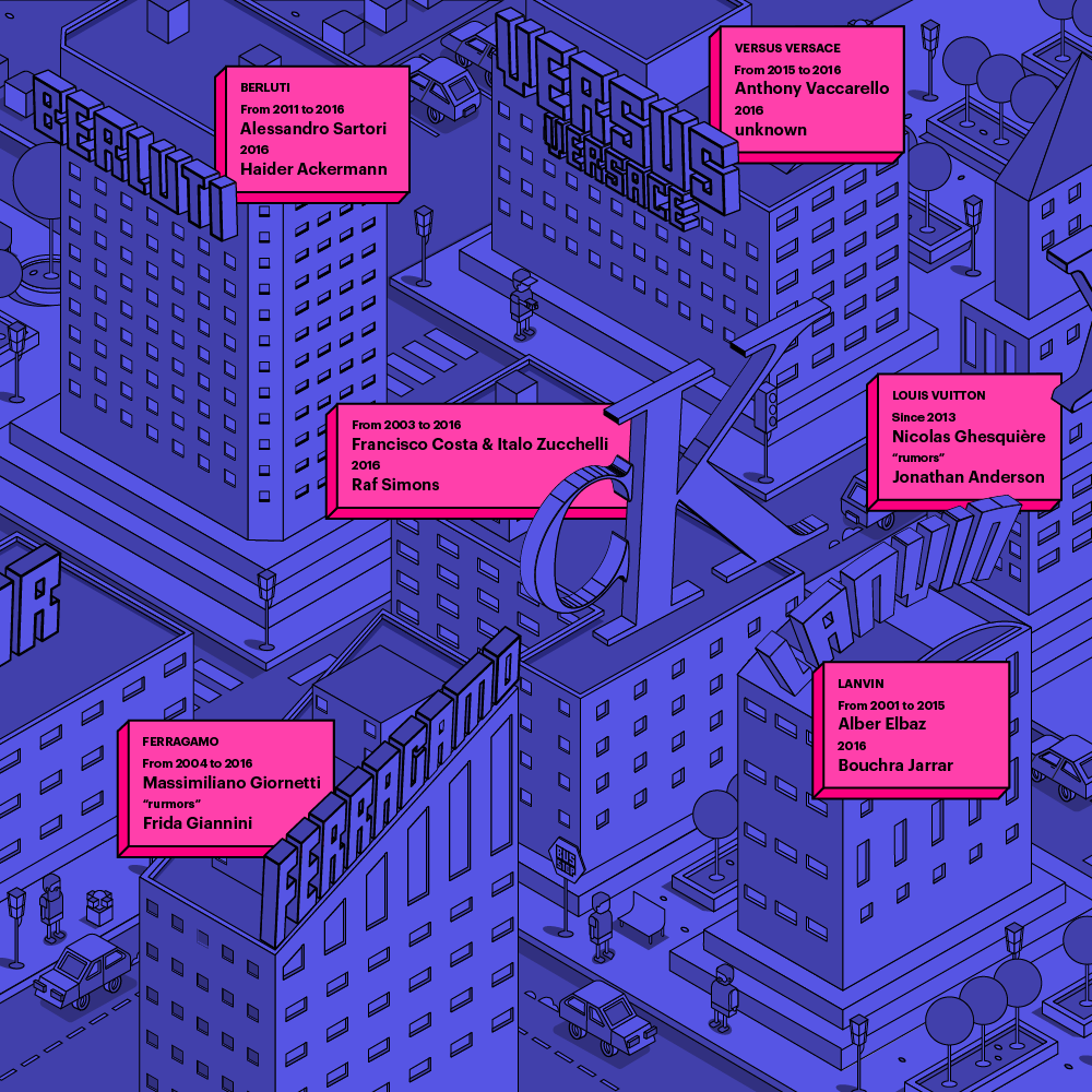 If you are confused by this rapid swirl of events, don’t despair. Our graphic designer Marcello Pisano decided to help you by giving life to a virtual city where every building is a (fashion) house, and its inhabitants are, of course, your favorite designers.
