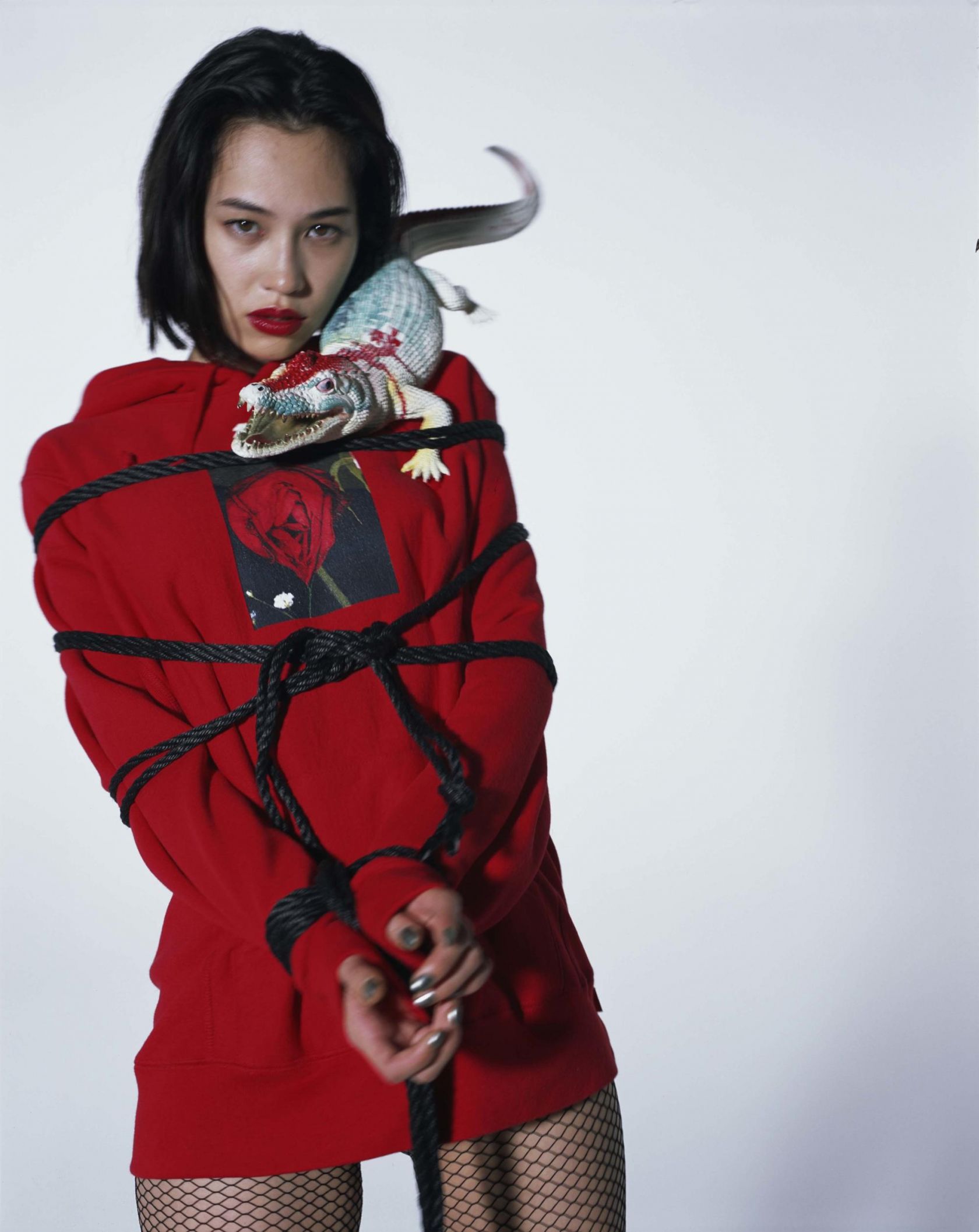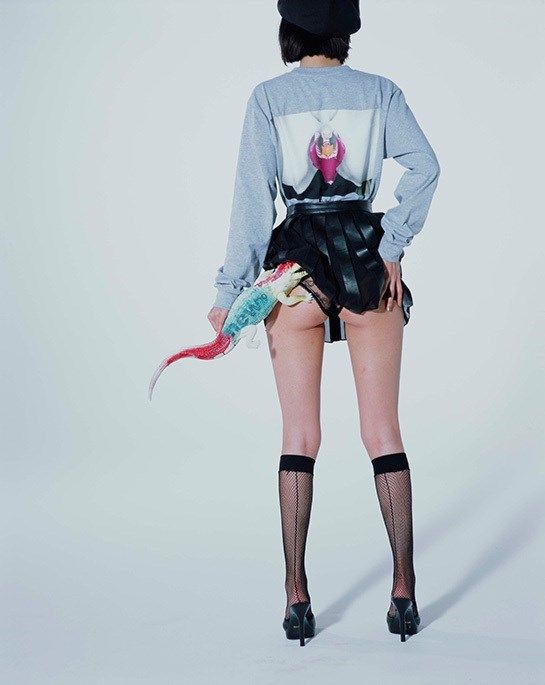 The collection consists of hoodies and T-shirts adorned with floral prints, roses and orchids taken from original shots by the artist. The images of the campaign, which feature Japanese model Kiko Mizuhara, were shot by Araki as well, and are a tribute to the "Kinbaku" – Japanese term for bondage.