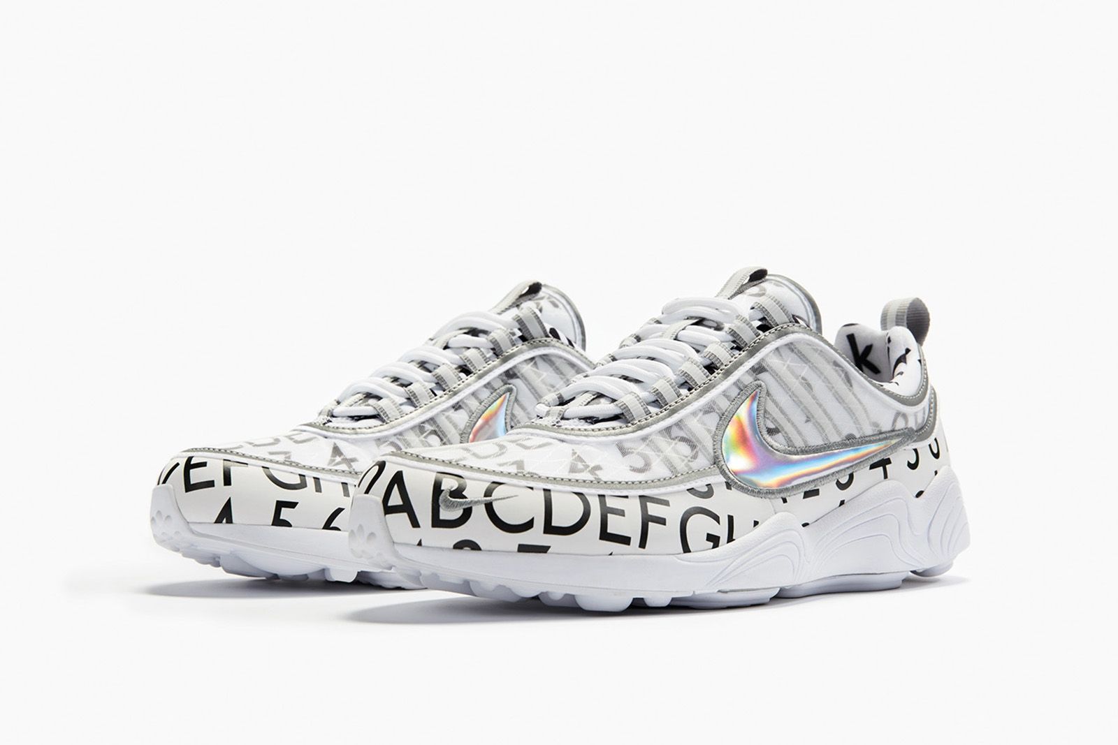 The sneaker, characterised by an iridescent swoosh on both sides, is available in two versions: white with black lettering and black and grey with white lettering, both with a white sole.