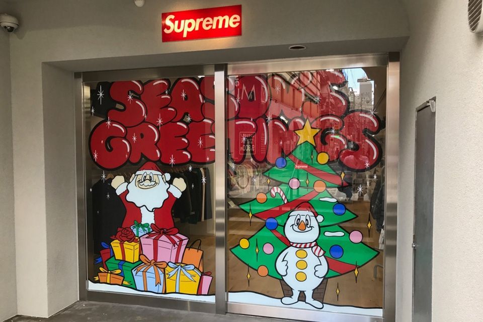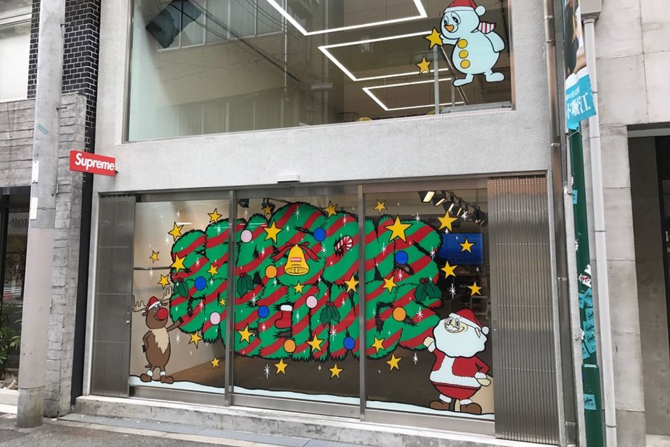 It's already Christmas at Supreme's store The store's windows featuring Sneakerwolf's graffiti