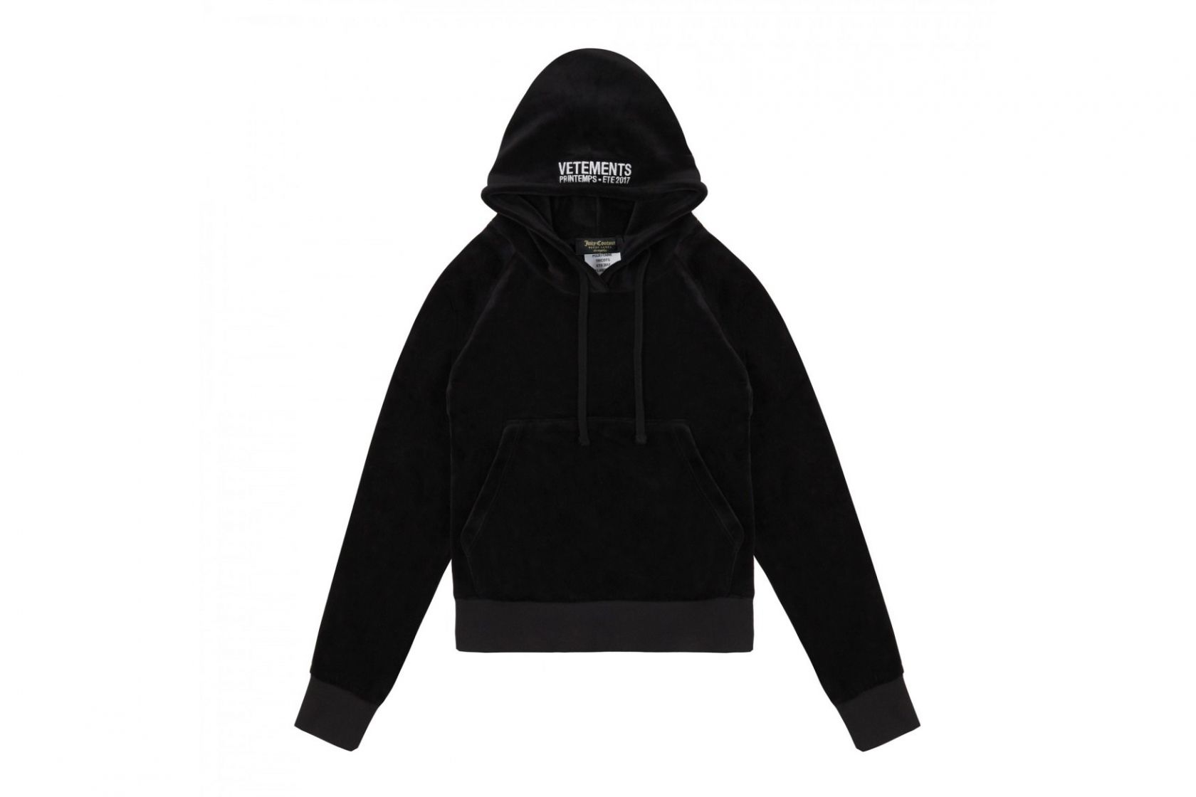 It is an assortment of baseball caps, backpacks, hoodes sweatshirts, sweatpants and shorts in white, blue and pink, but also a black sweatshirt Vetements x Juicy Couture embellished with the famous words "Juicy" silver sequins on the back.