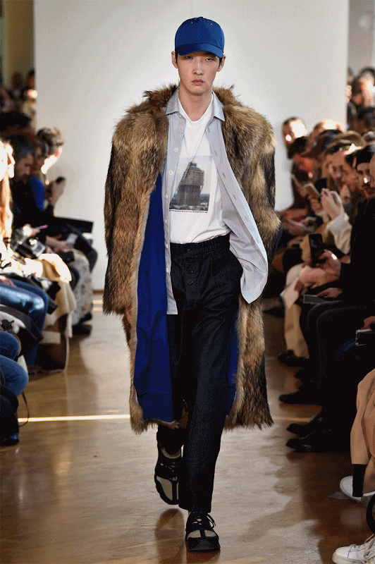 Sunnei, brand founded in 2013 by Simone Rizzo and Loris Messina, carries a young winter collection, joyful, hyper relaxed and cool, defined by the designer duo "the image of a group of teenagers who run away from home to go to a party wearing the best dresses of their wardrobe". And what are these leaders? Ultra contemporary pieces. Good tailoring bill mixed with shapes inspired by street style and punchy prints: heavy sweaters, fur coats, raw denim, graphic tees, wide leg pants and oversized cotton shirts, in a peach, yellow, olive, brown and blue color.