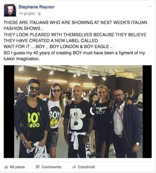 The story begins in 2013 when an Italian company in Barletta (Puglia), has decided to start a mass production of items clearly inspired (read: brutally copied) on the eponymous British brand. Perverting the punk and elitist identity of the original brand, this Italian game has a perfectly legal facade; the “Boy London Italia” brand is thus registered so it bears the “original” inscription on all its items - both the sold and the given away - increasing the belief of the buyers of owning the original line simply bought from an italian dealer.