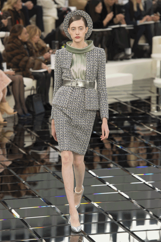 It all starts with Alberto Giacometti. There is his sculpture of the Twenties "Femme cuillère" behind the collection Chanel Haute Couture SS17. Karl Lagerfeld is inspired by the spoon-shaped work and silver to create to dress girls who seem "moving drawings, impeccable, rigorous and clean". These young mademoiselle have little shoulders, narrow waist and hips inflated, chignon ordered, anklets of pearls and rediscover the beauty of the tailleur. The classic tweed suit is painted with gray and pastel colors, it is made with a precious wool boucle and is worn with high waisted belt, silver decolletè and crushed Basque. Then, in a setting made of mirrors, arrive sequined top, skirts in marabou, fluffy ruffles and flounces. Everything shines, everything is light, luxury. Lily Rose Depp, bride in a pink cloud, closes the show.