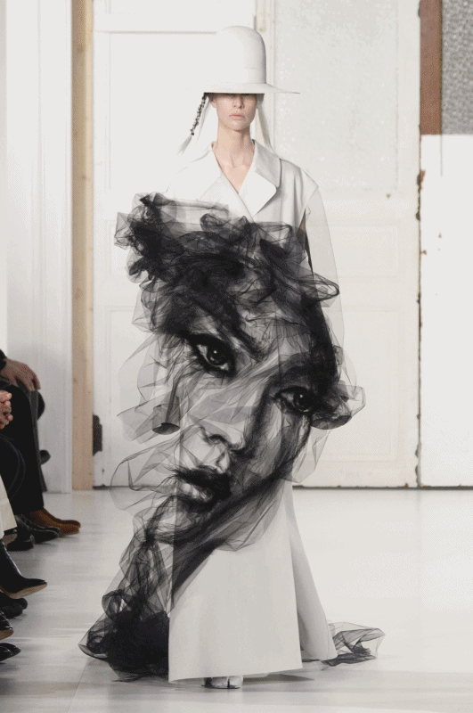 The reflection on the obsessive use of images and messages in social networks become a sophisticated reflection on fashion. This week dedicated to the Haute Couture John Galliano introduces copy-paste and Snapchat deformed or funny faces in his collection for Maison Margiela. The designer embroiders childish scribbles, carving faces, superimposed materials and garments, but also periods and styles, drapes, models, deconstructs, ragged coats and trench to show their backbone. Each creation is flayed and reduced to its essential structure, focusing on the human element. It's fashion, but not only, is poetry and theater.