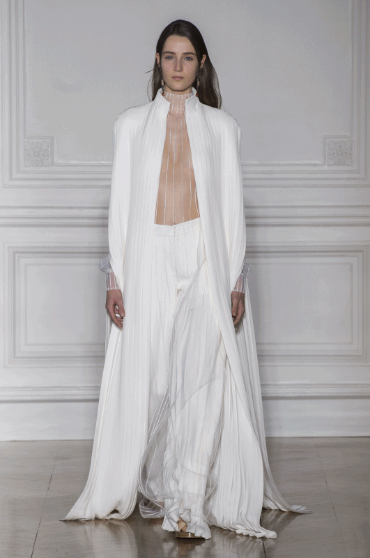 “I started from the famous quote: we are made of the same stuff as dreams are made, from Shakespeare's The Tempest. In couture, in fact, there is no time, as happens in dreams. There is eternity. It's a particular territory, enchanted with its laws and its rituals. I celebrated precisely the latter: the fact, for example, to cover every outfit, at the evening, with white tissue, like a living thing, to care with affection. That idea of veils that cover the clothes he finds himself on the catwalk. The tulle gives each look a sense of humanity, care, affection. True hides the embroideries, the atelier artifice. But in my opinion the returns exceptional depth”. With these words Pierpaolo Piccioli talks about Valentino Haute Couture collection. The designer takes all the atelier rites and mixes them with the Greek myths, part of our collective unconscious. Clothes, beautiful, evoke the image of divinity is from them are named. Apollo is a masterpiece of braids of tulle and chiffon in 15 different shades of yellow, there is Prometheus, chiton, ionic sleeveless tunic, lace decorated with velvet flames. There are Eurydice, dress-column crepe pleated, and Galatea a cascading chiffon embroidered with rhinestones and silver micro paillettes, but Galatea, Venus, Hera, Artemis, Demeter, for a total of 59 models. Valentine this time dress the purity, lightness, grace, elegance of essentiality.