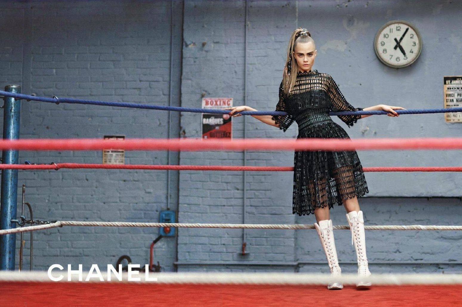 Certainly, the boxing-inspired collection that everyone remembers is John Galliano's FW04 menswear collection, with the models with their bruised and bleeding faces, their bodies covered in shiny oil, their boxers emerging from their trousers like the elastic of boxing shorts. It was then in January 2009 that, during Milan Fashion Week, Alexander McQueen presented a capsule collection in collaboration with Puma that was inspired by the world of boxing. A year later, in January 2010, a men's collection by Jean-Paul Gaultier showed in Paris that was entirely focused on boxing, complete with gloves, towels around the neck and trainers as high as boots. Another year and the trend moved from the catwalk to reality, with Dolce & Gabbana creating and dressing their own boxing team, the Dolce & Gabbana Milano Thunder, which took part in the World Series of Boxing and bore their name until the 2013-14 season. Outside of the ring, it was Clare Waight Keller who came up with leather boxing shorts for Chloé's FW12 collextion while, in 2014, Karl Lagerfeld made the emplein by designing a boxing set for Louis Vuitton complete with bag, gloves and a training mat and then shot Cara Delevigne in a boxing ring for Chanel's FW14 campaign.