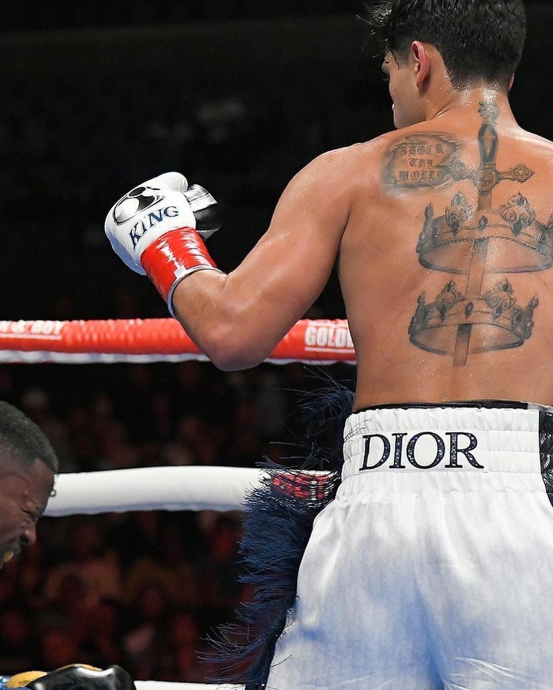 The following year it was Philipp Plein's turn to sign a ring-inspired collection presented at Piazza Vetra, Milan, where the collaboration between Ports 1961 and Everlast was presented the following year. In 2018 it was Virgil Abloh who signed a collaborative Off-White x Selfridges capsule inspired by boxing while in 2019 Versace created boxing gloves covered in his baroque pattern and Balmain collaborated with Puma creating a campaign that saw Cara Delevigne return to the ring. In 2021, after the lockdown, Mike Tyson made headlines for his appearance in Cavalli's campaign and S.S. Daley created a look inspired by early 20th century boxing suits for his brand's SS22. More recently, Dior signed boxing prodigy Ryan Garcia's outfit and John Lawrence Sullivan created a boxing-themed collaboration with Everlast.
