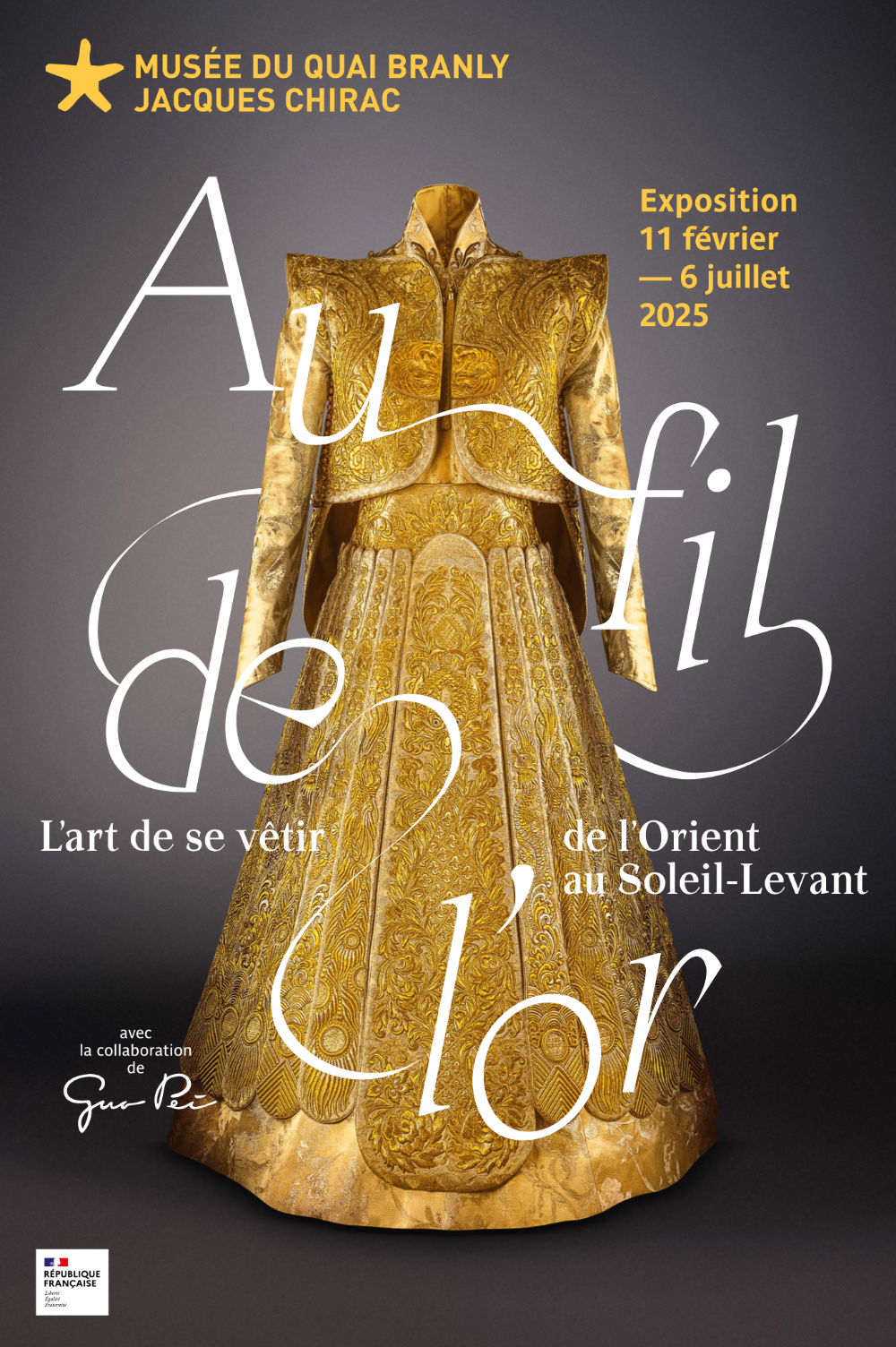 From February 11 to July 6, 2025, the exhibition “Au fil de l'or: The Art of Dressing from the East to the Rising Sun” shines at the Quai Branly. Covering regions from North Africa to Japan, including the Middle East, India, and China, the exhibition explores the millennia-old history of gold in textile arts, blending artistic creation, traditional craftsmanship, and technical innovation. From the first ornaments sewn onto garments for the deceased to the dazzling dresses of Chinese designer Guo Pei, the exhibition journeys through two historical and technical sections and five geographic and cultural areas. Visitors will also discover “themed bubbles” showcasing three materials resembling gold but not actually gold: sea silk (byssus from Pinna nobilis), golden spider silk from Madagascar, and Cambodian golden silk. The exhibition concludes with a spotlight on gold embroidery in France, particularly the Maison Lesage, which has contributed to the finest haute couture creations for over 100 years. Don’t miss this illuminating exhibition next month at Quai Branly!